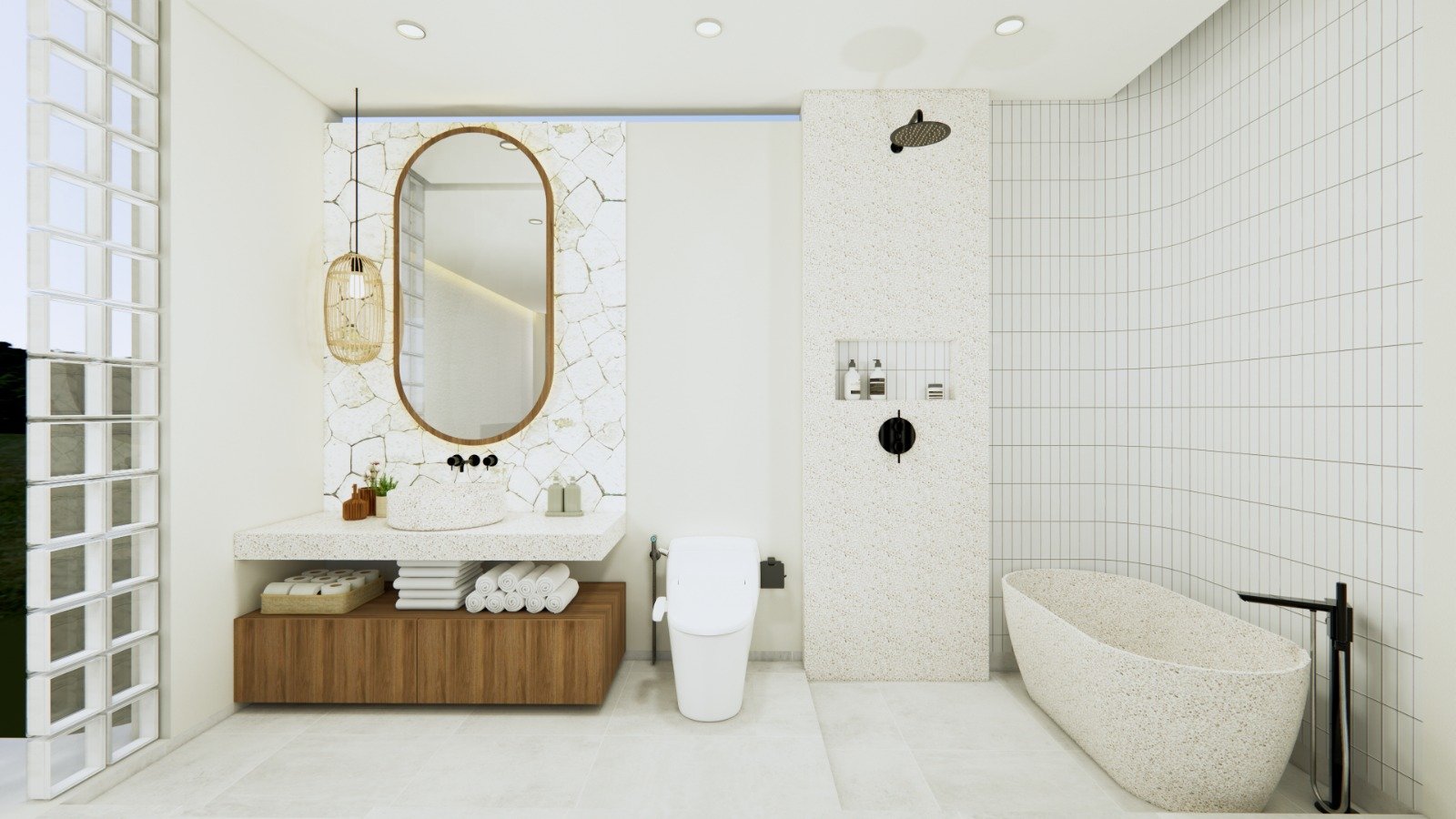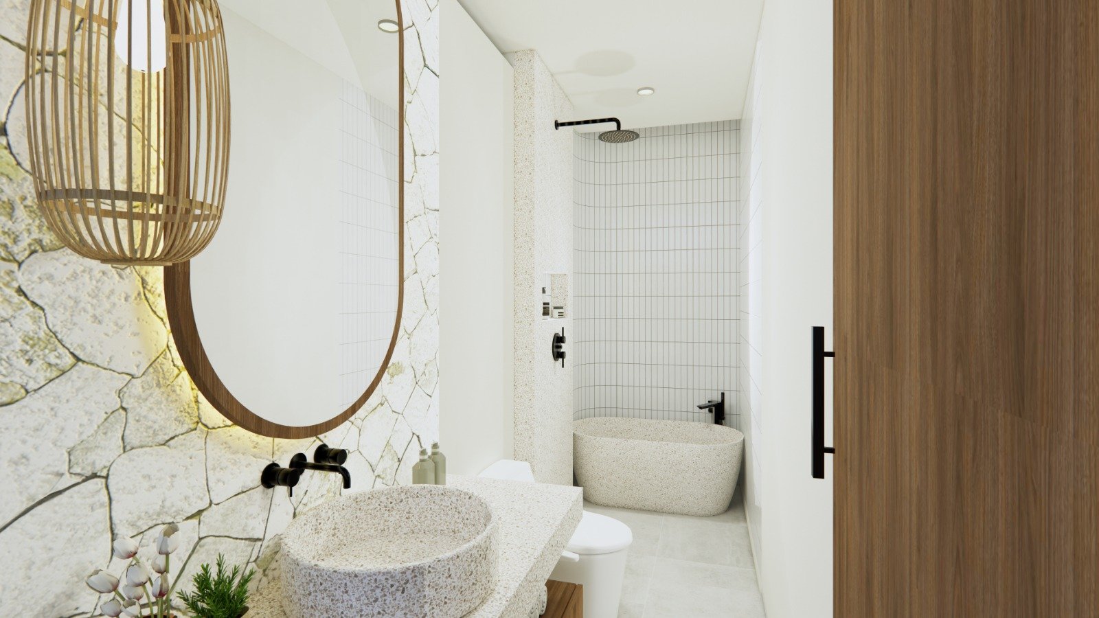 Every detail is thoughtfully curated — from the natural stone finishes and warm wooden accents to the modern bathroom with a freestanding terrazzo bathtub. Large glass panels invite abundant natural light, creating a bright and airy atmosphere.