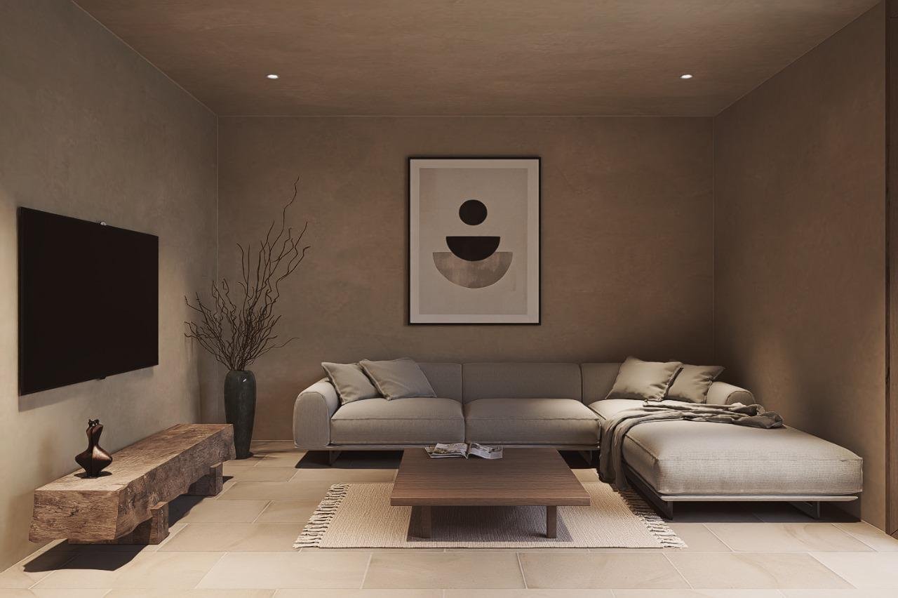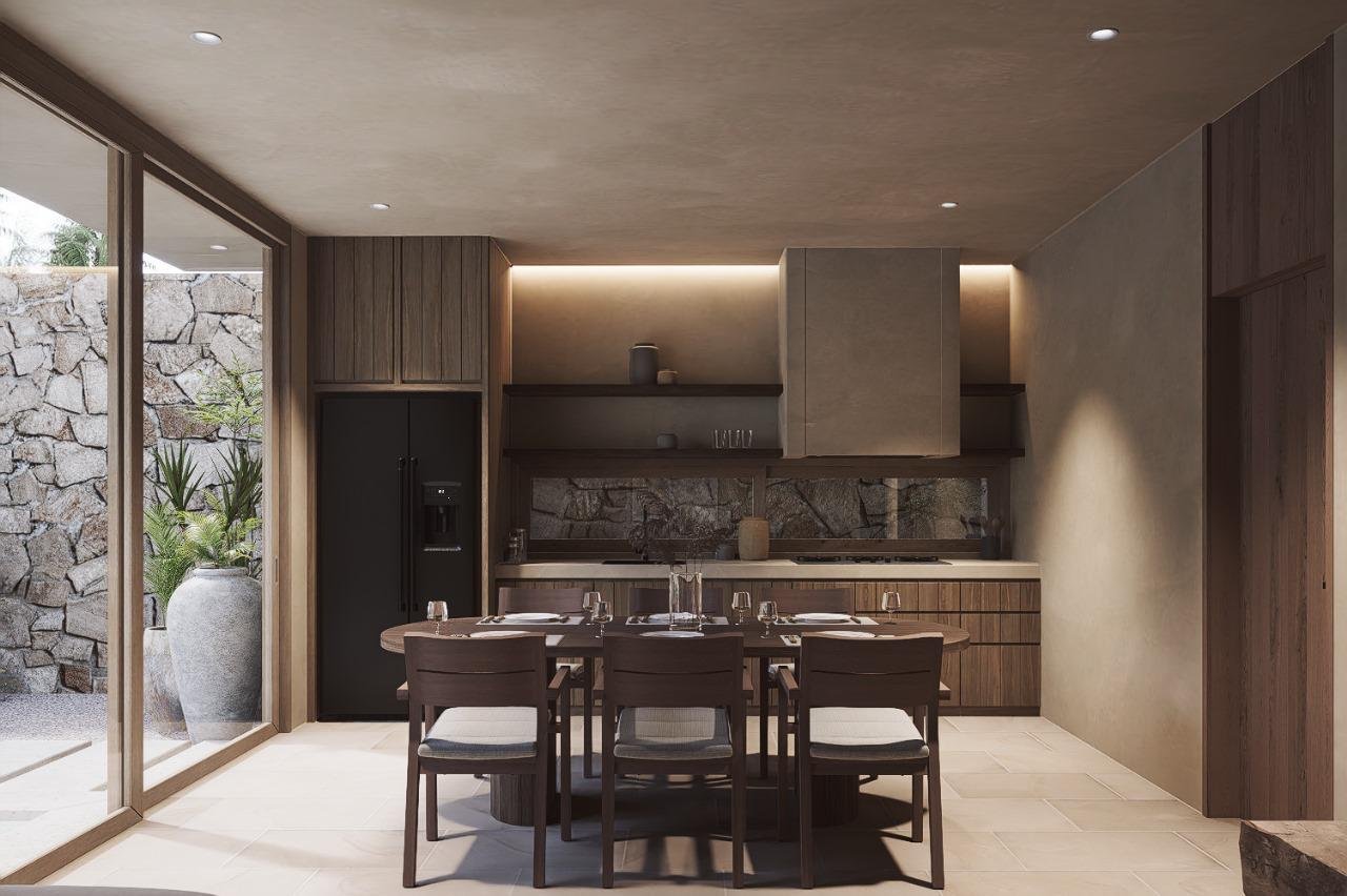 The interior showcases earthy tones, natural textures, and warm lighting, creating a cozy and inviting ambiance. The open-plan living and dining area connects directly to a private pool and sun deck, perfect for unwinding under the Balinese sun.