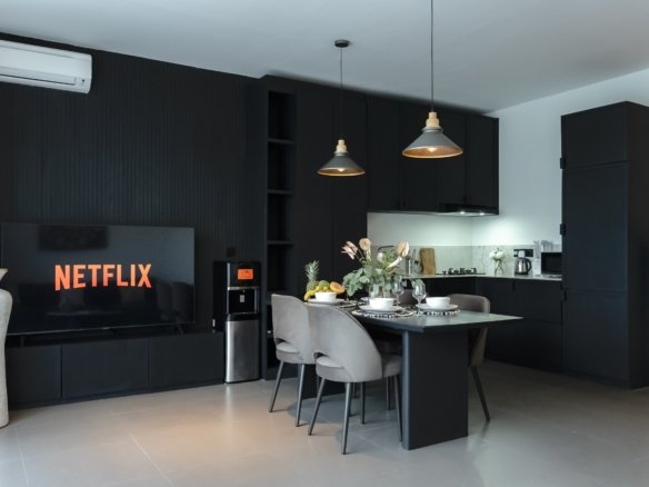 With a total area of 80 square meters, the townhouse features two spacious bedrooms, each with an en-suite bathroom, a generous living area, and a well-designed pantry and dining space. Large panoramic windows allow natural light to flow throughout the interior while framing uninterrupted ocean views, creating a bright and sophisticated living environment for both residents and guests.