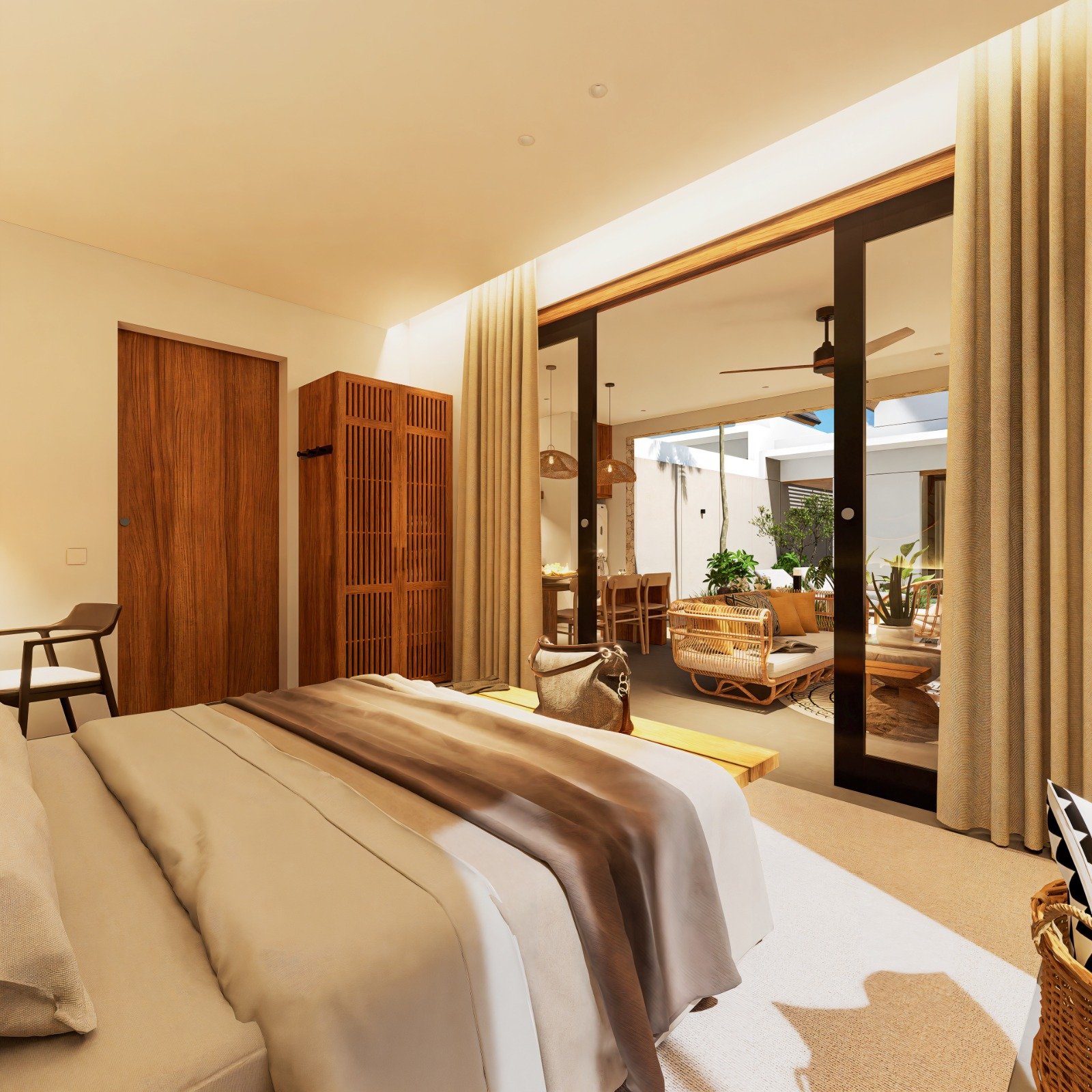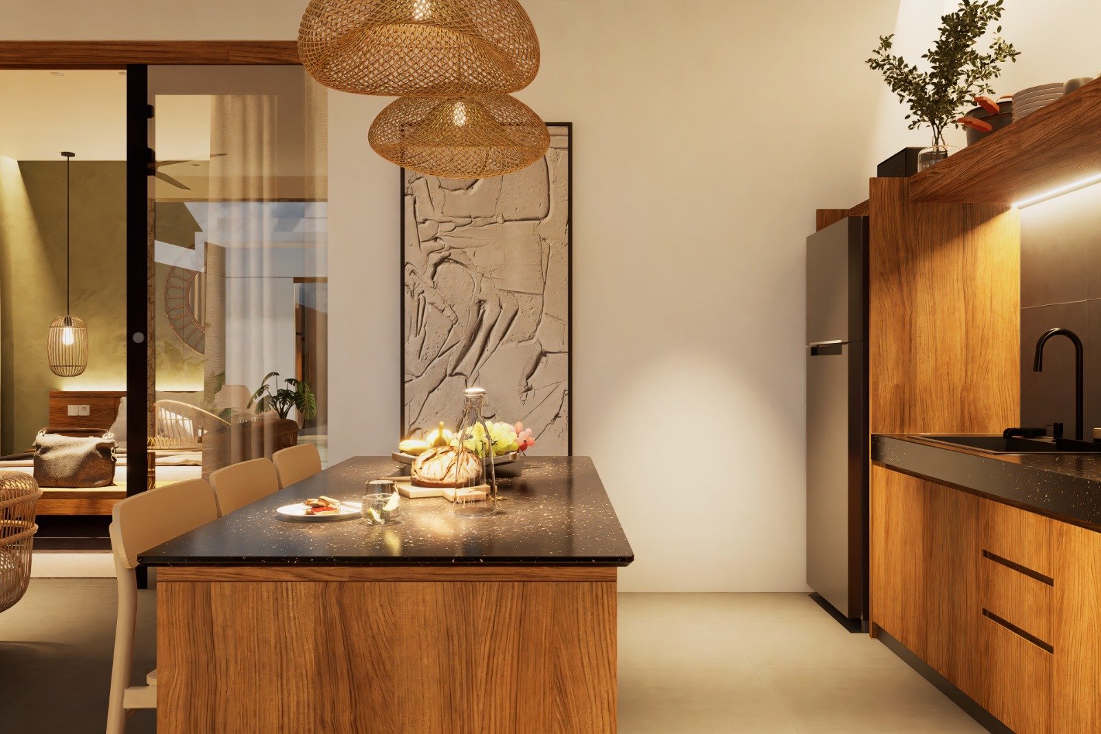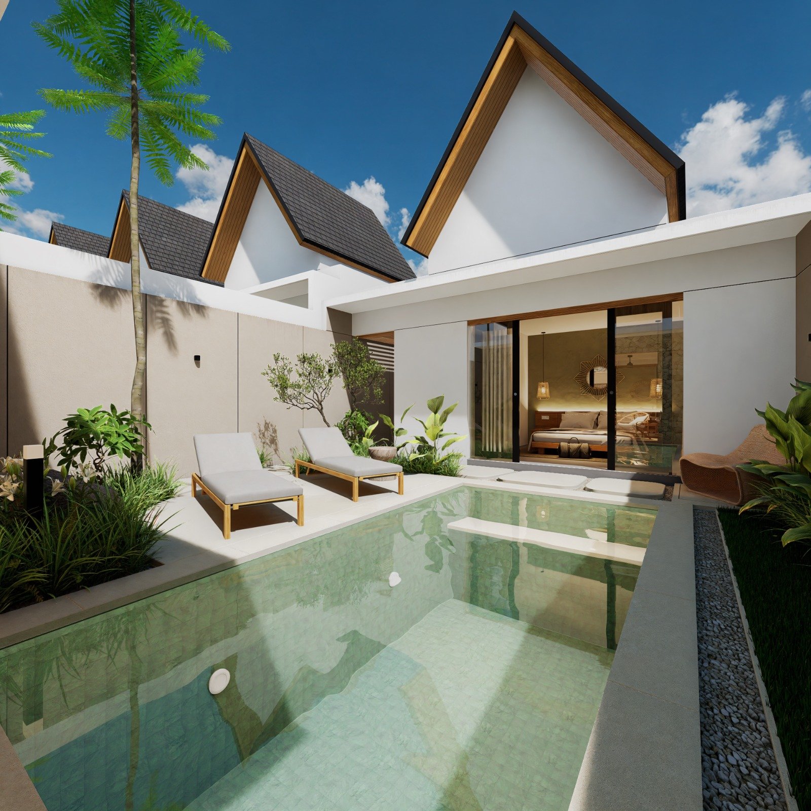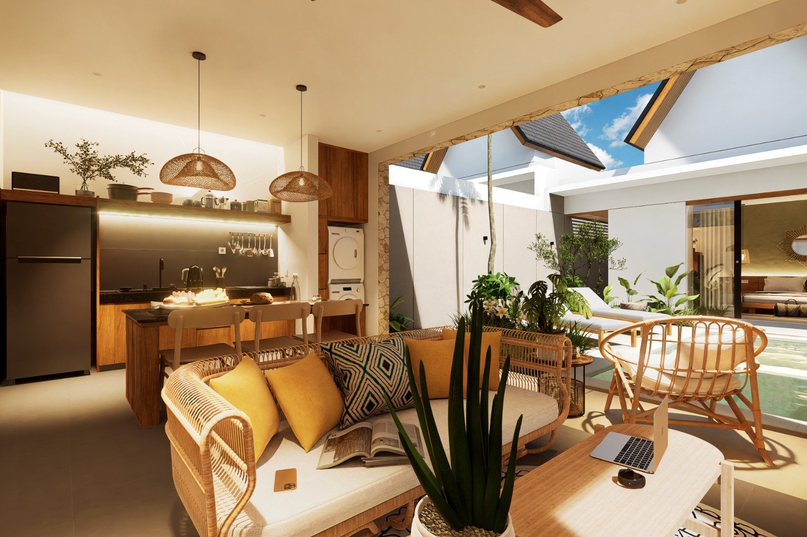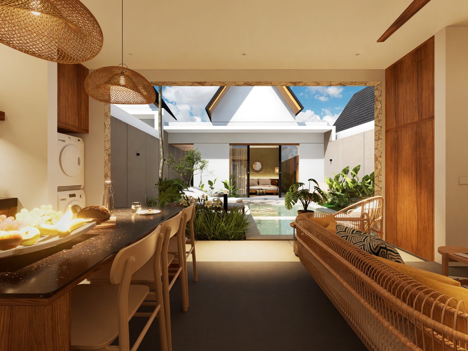 The villa comes fully furnished and is available starting from 2 billion IDR under a 25-year leasehold. With a spacious access road over 4 meters wide, it offers both comfort and convenience. The semi-open living room and pantry create a relaxed and inviting space, perfect for entertaining or unwinding at the end of the day.