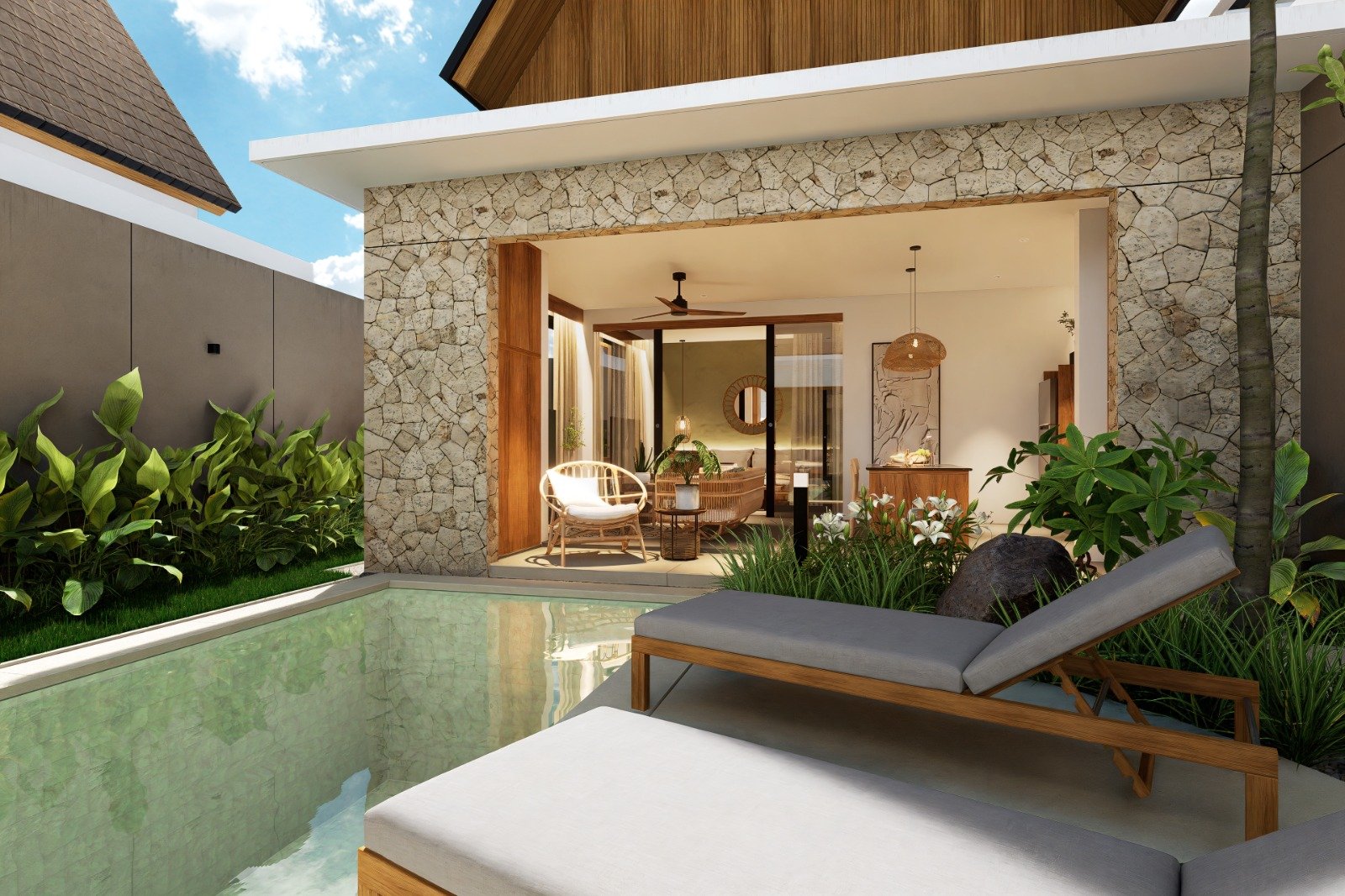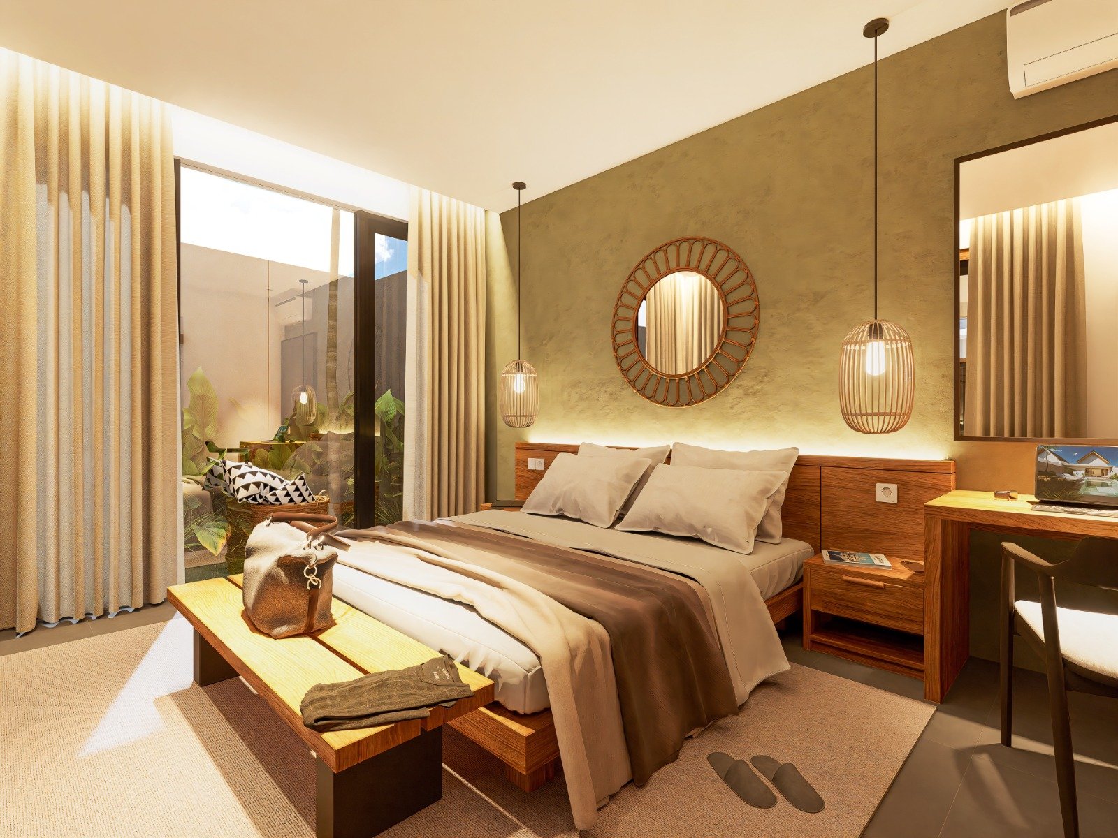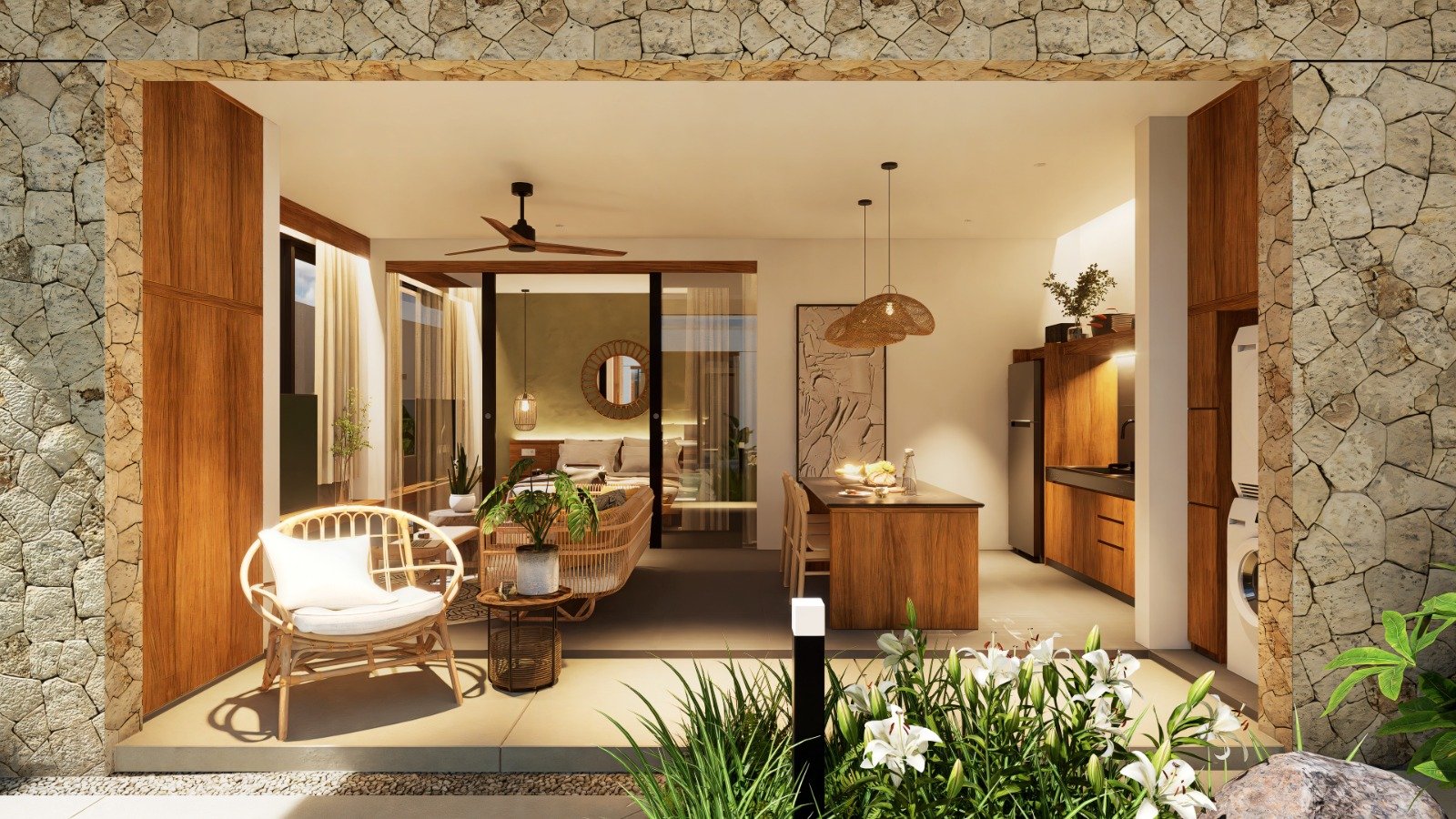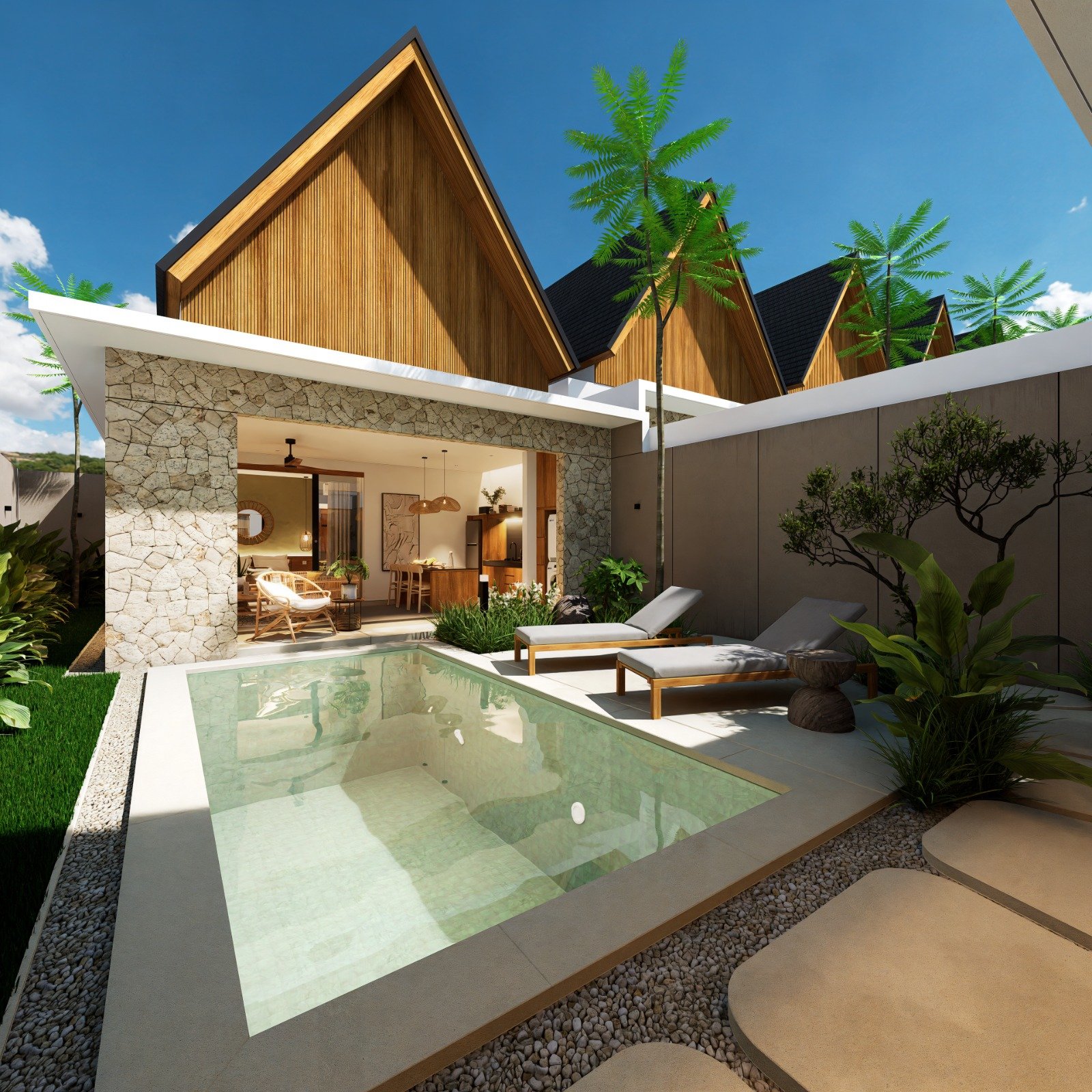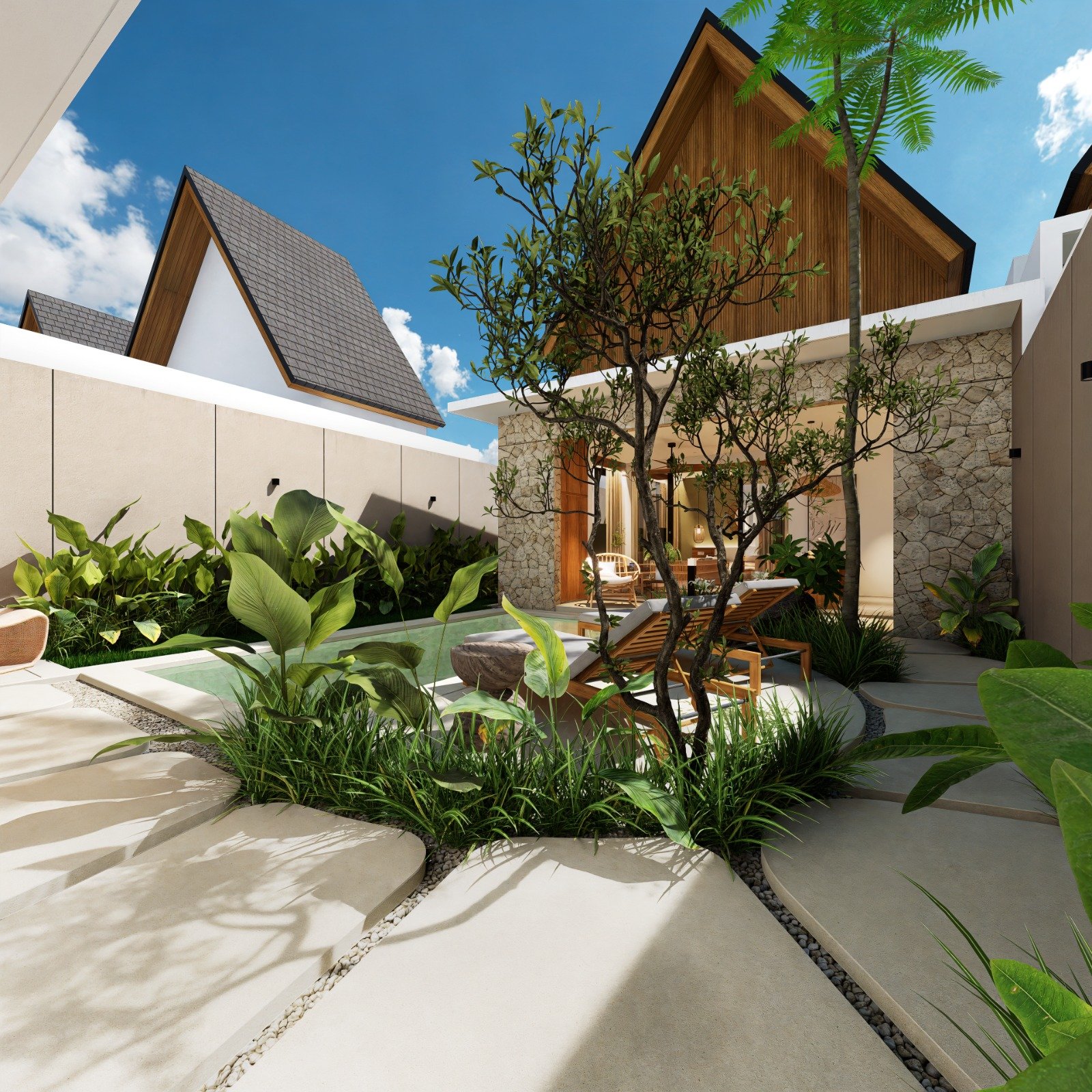 The villa comes fully furnished and is available starting from 2 billion IDR under a 25-year leasehold. With a spacious access road over 4 meters wide, it offers both comfort and convenience. The semi-open living room and pantry create a relaxed and inviting space, perfect for entertaining or unwinding at the end of the day.