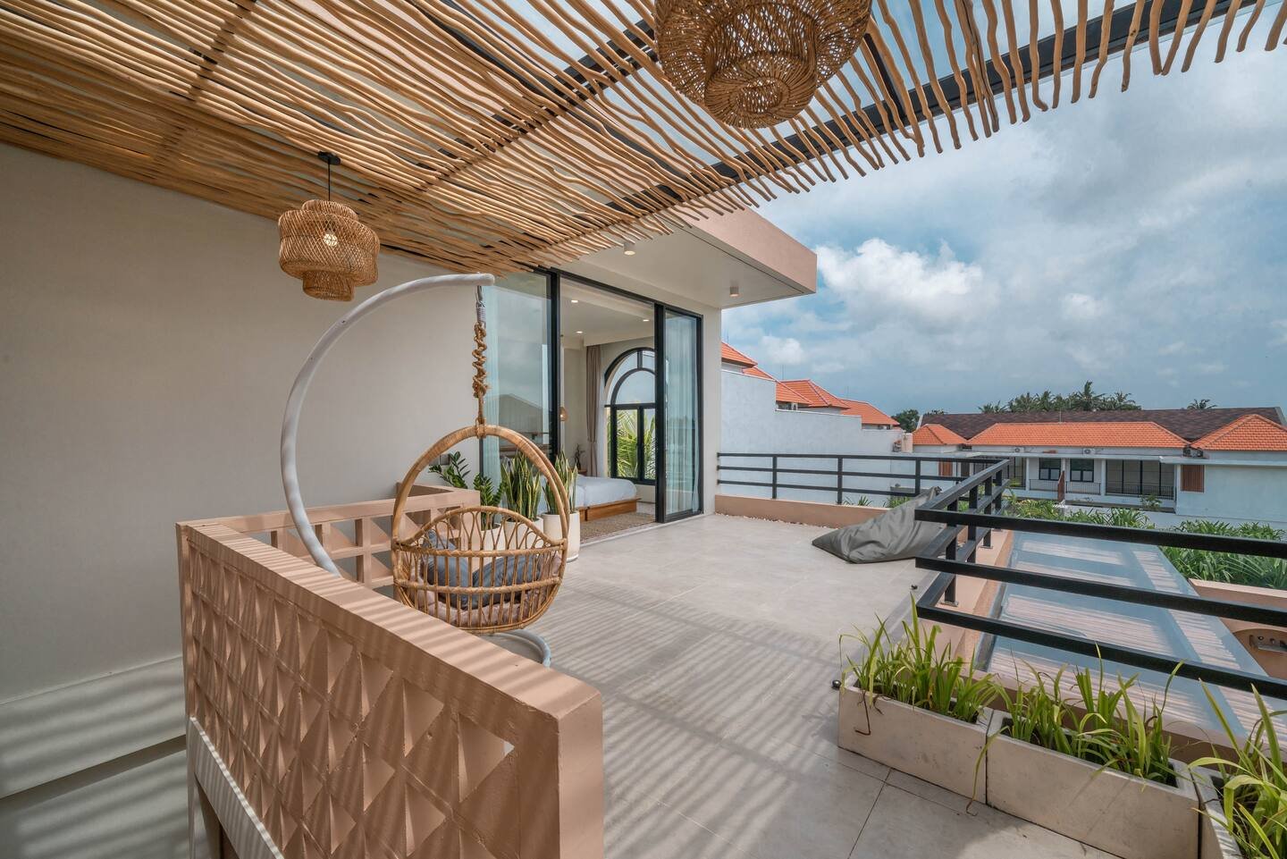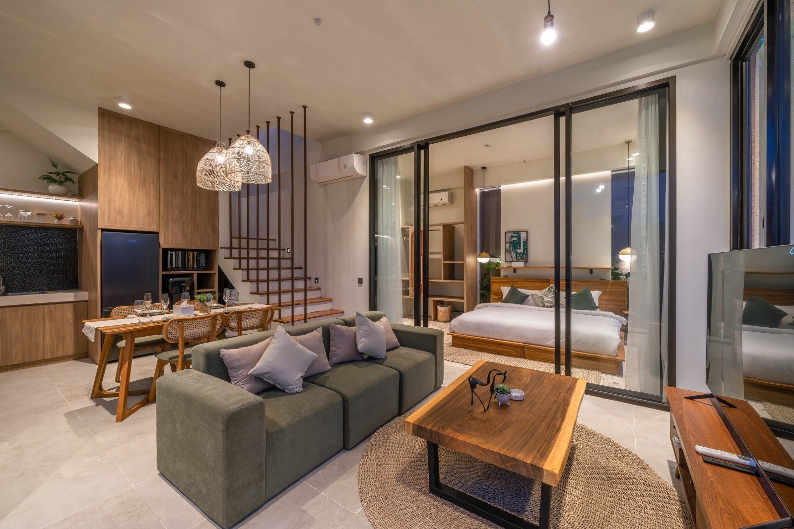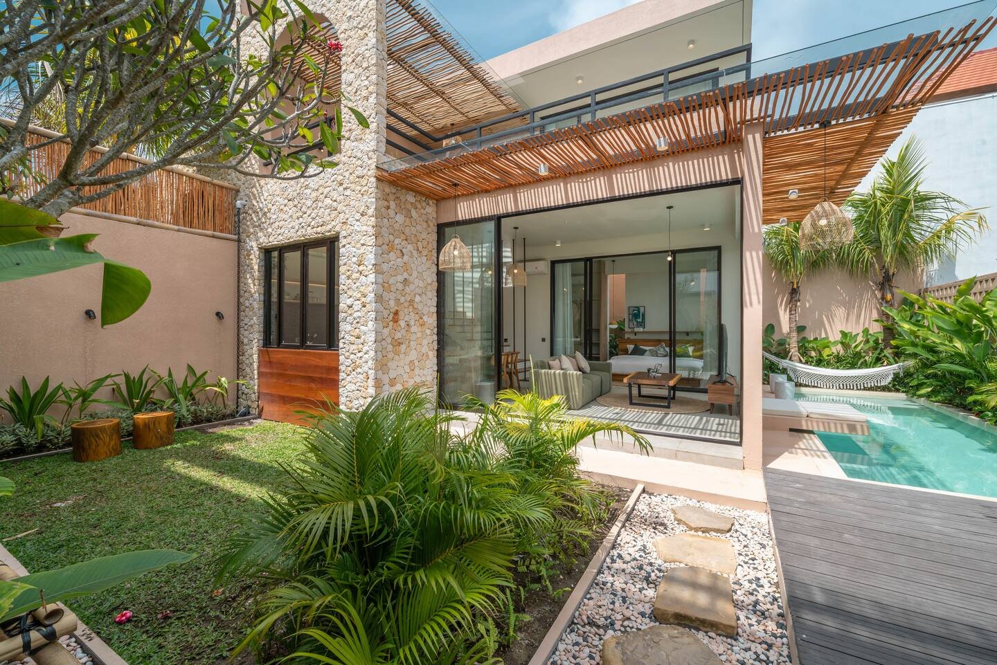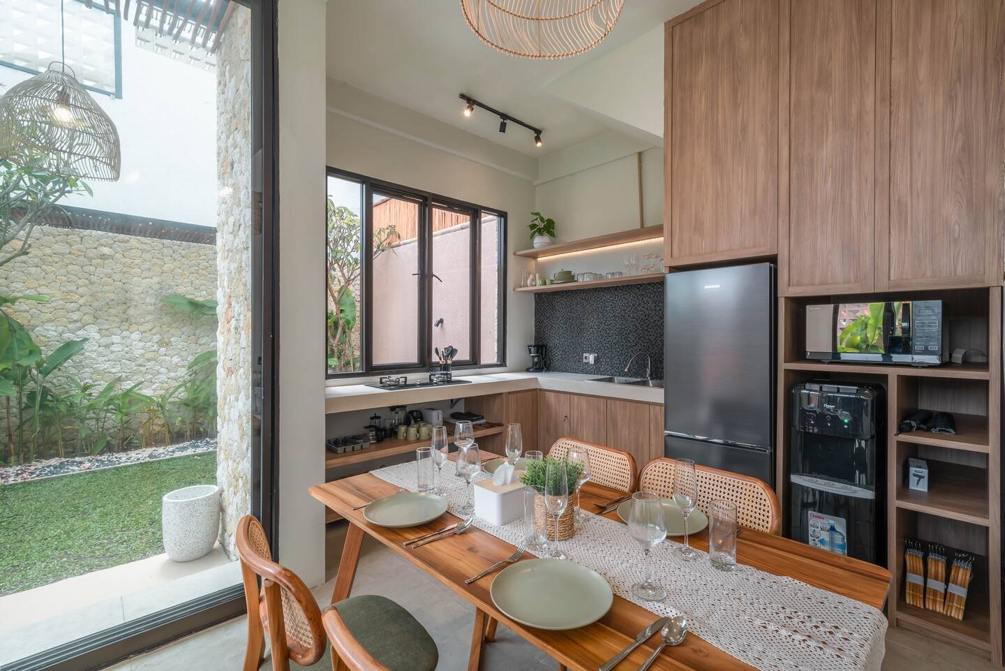 The elegant two-story layout creates a seamless connection between indoor and outdoor spaces. The ground floor features a bright living area that opens to a lush garden and private pool, providing the perfect setting for relaxation or entertaining. A modern kitchen and dining area add to the comfort, while both bedrooms include ensuite bathrooms for privacy and convenience. Ascend to the second floor, where a bright and airy lounge area awaits, offering a peaceful retreat filled with natural light through expansive floor-to-ceiling windows. From here, you can admire sweeping views of the surrounding greenery, allowing nature’s calm to flow into the space, and step out onto a charming patio — a truly enchanting spot perfect for relaxing with a morning coffee or enjoying the gentle evening breeze as the sun sets over Tumbak Bayuh.