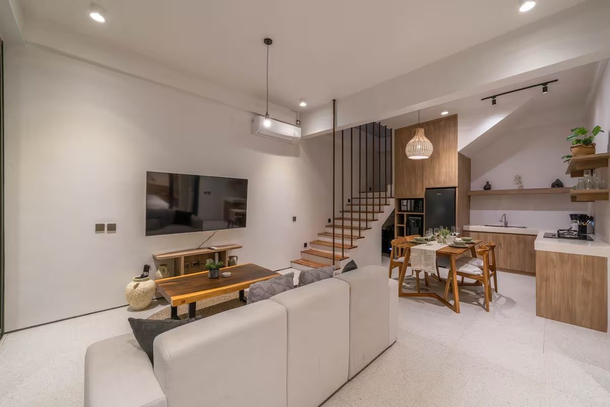 Ascend to the second floor, where a spacious lounge area bathed in natural light awaits. Through its floor-to-ceiling windows, can admire panoramic views of the surrounding greenery, allowing nature’s calm to flow seamlessly indoors. Step out onto the charming patio — an enchanting space perfect for a morning coffee or an evening unwind as the sun sets over Tumbak Bayuh.