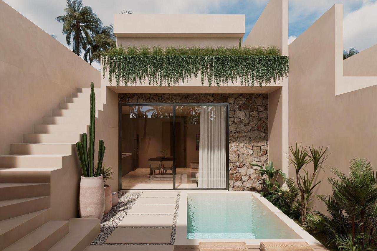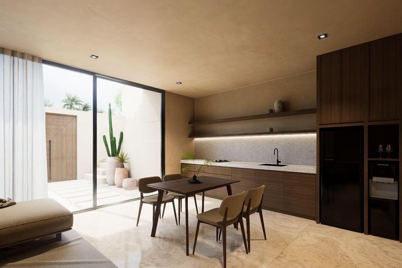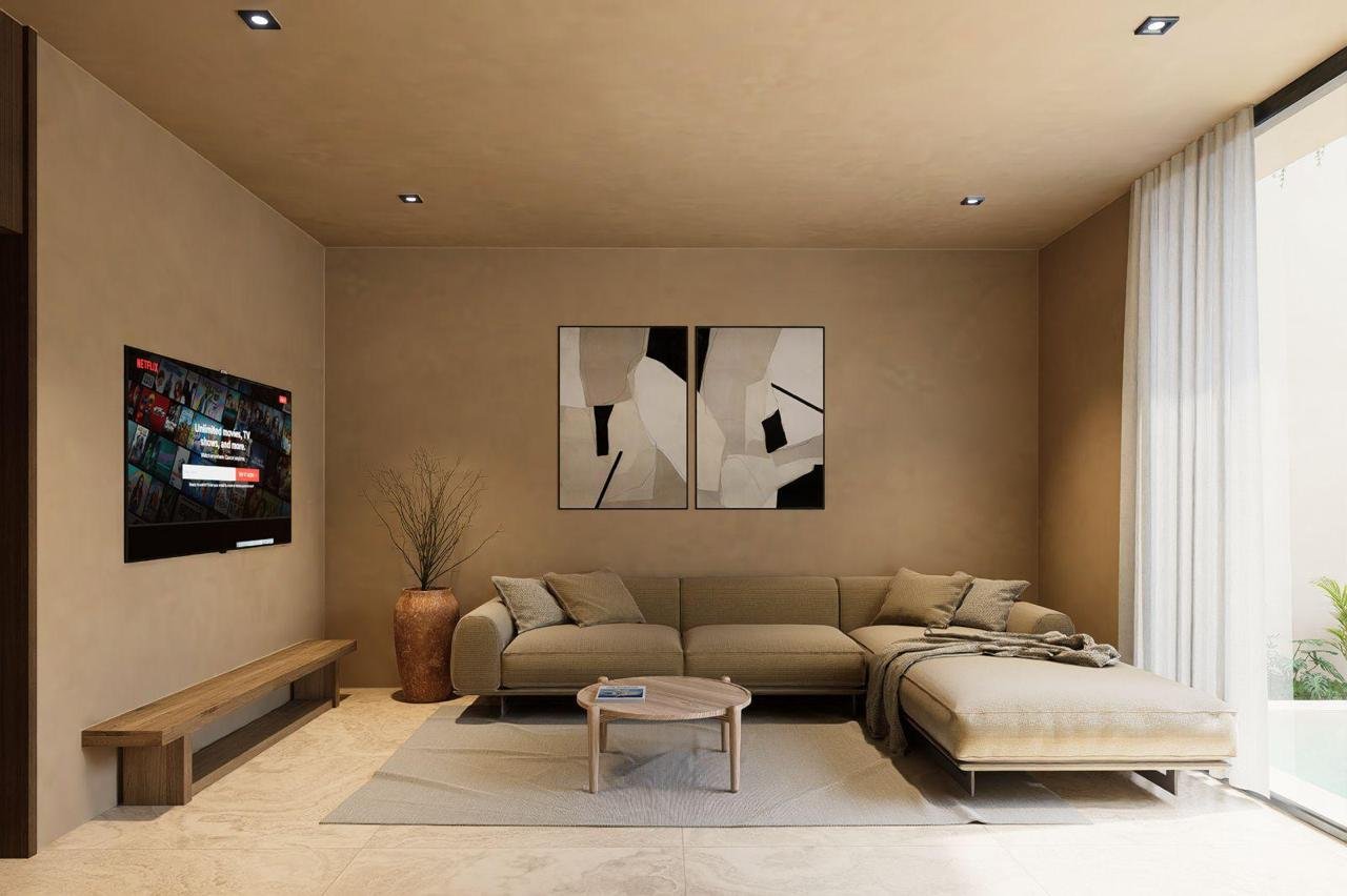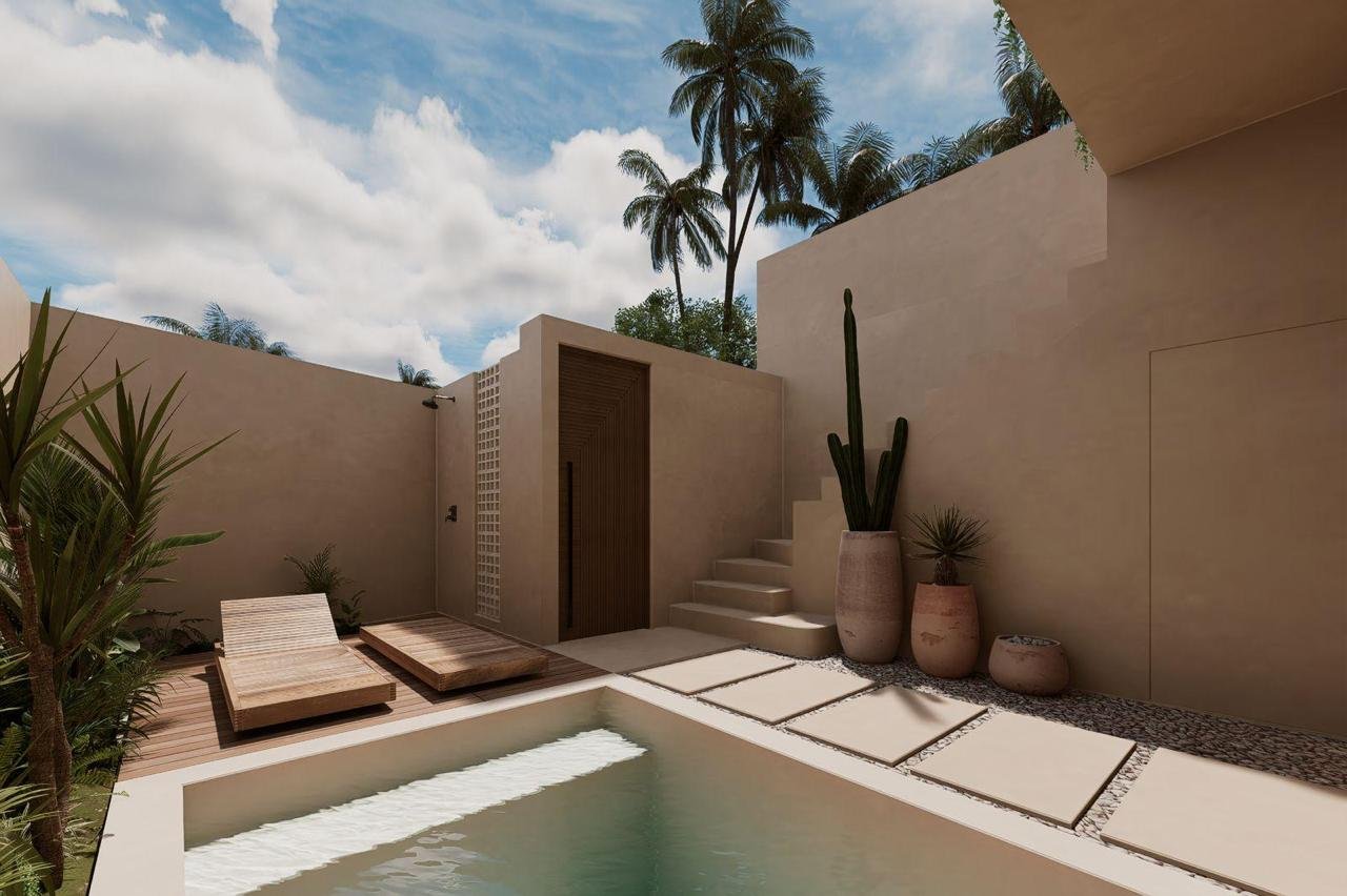 The interior showcases earthy tones, natural textures, and warm lighting, creating a cozy and inviting ambiance. The open-plan living and dining area connects directly to a private pool and sun deck, perfect for unwinding under the Balinese sun.