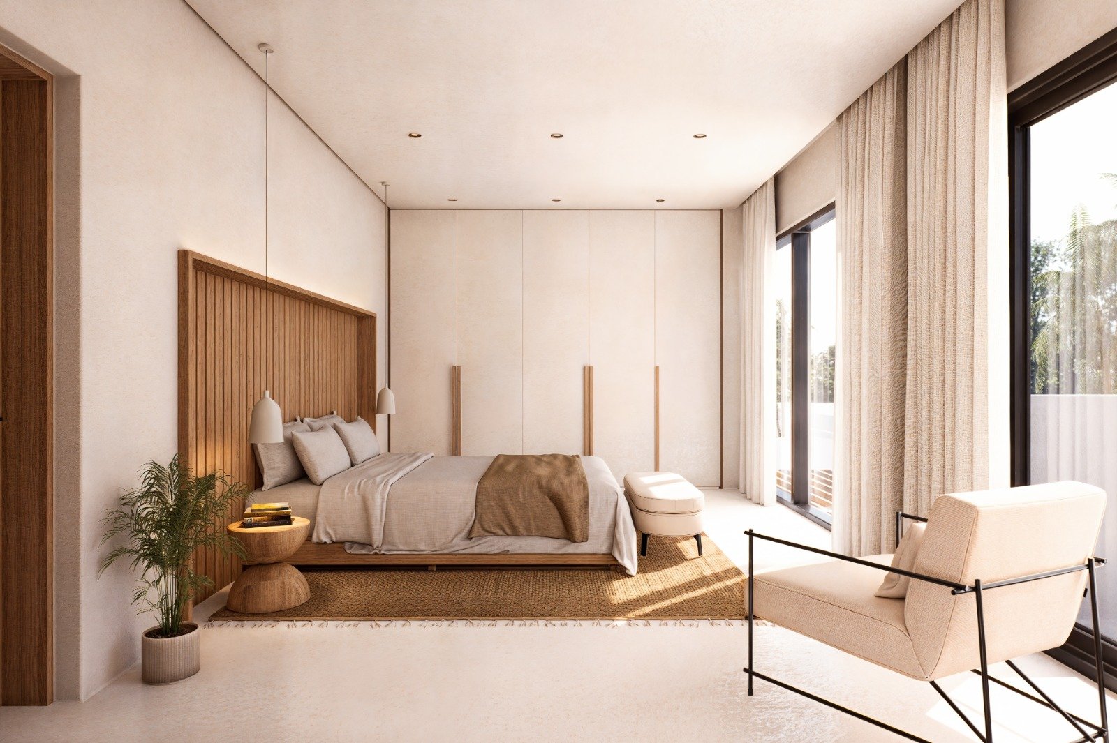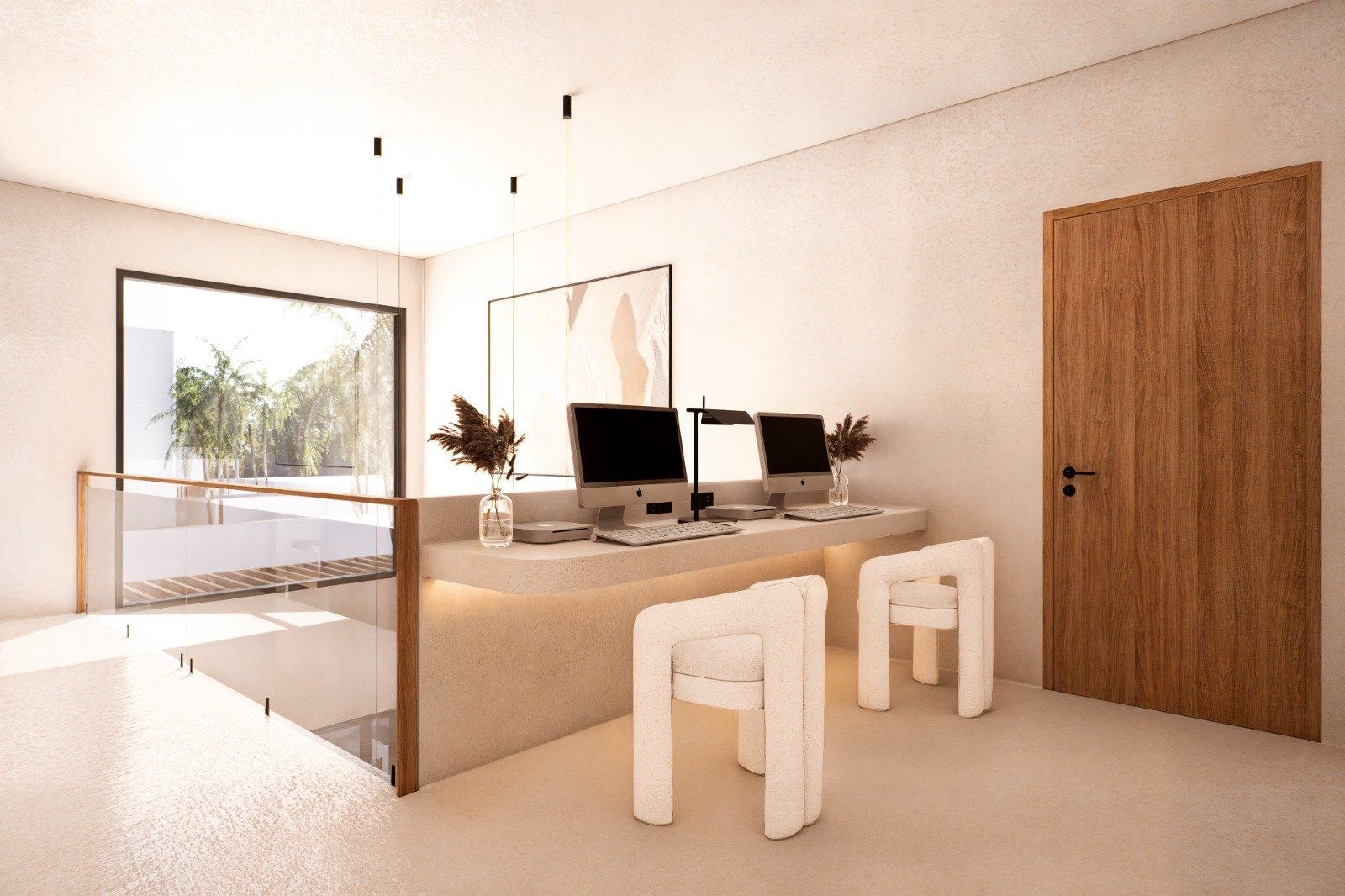 The villa features two bedrooms, each with an en-suite bathroom, providing privacy and comfort for residents and guests. A thoughtfully integrated working space adds flexibility for remote work or creative activities.