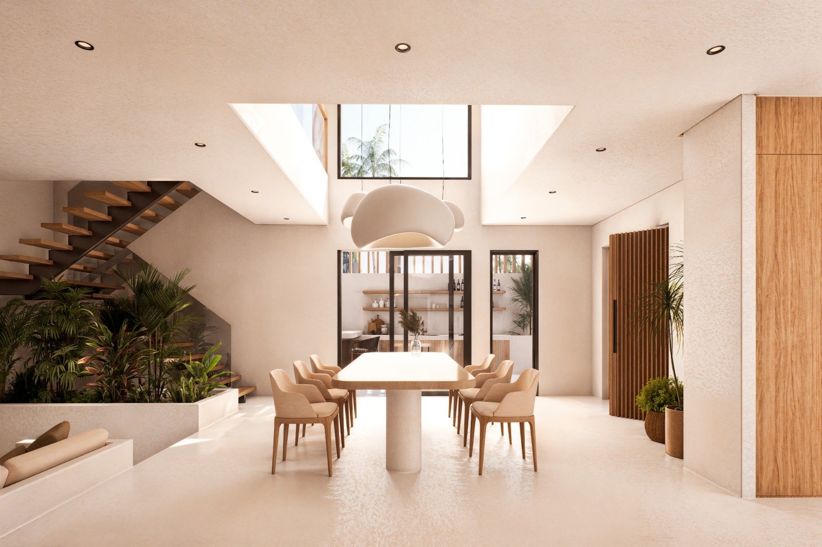The open-plan living, dining, and kitchen area serves as the central living space, designed to maximize natural light and airflow while creating a seamless connection to the outdoor area.