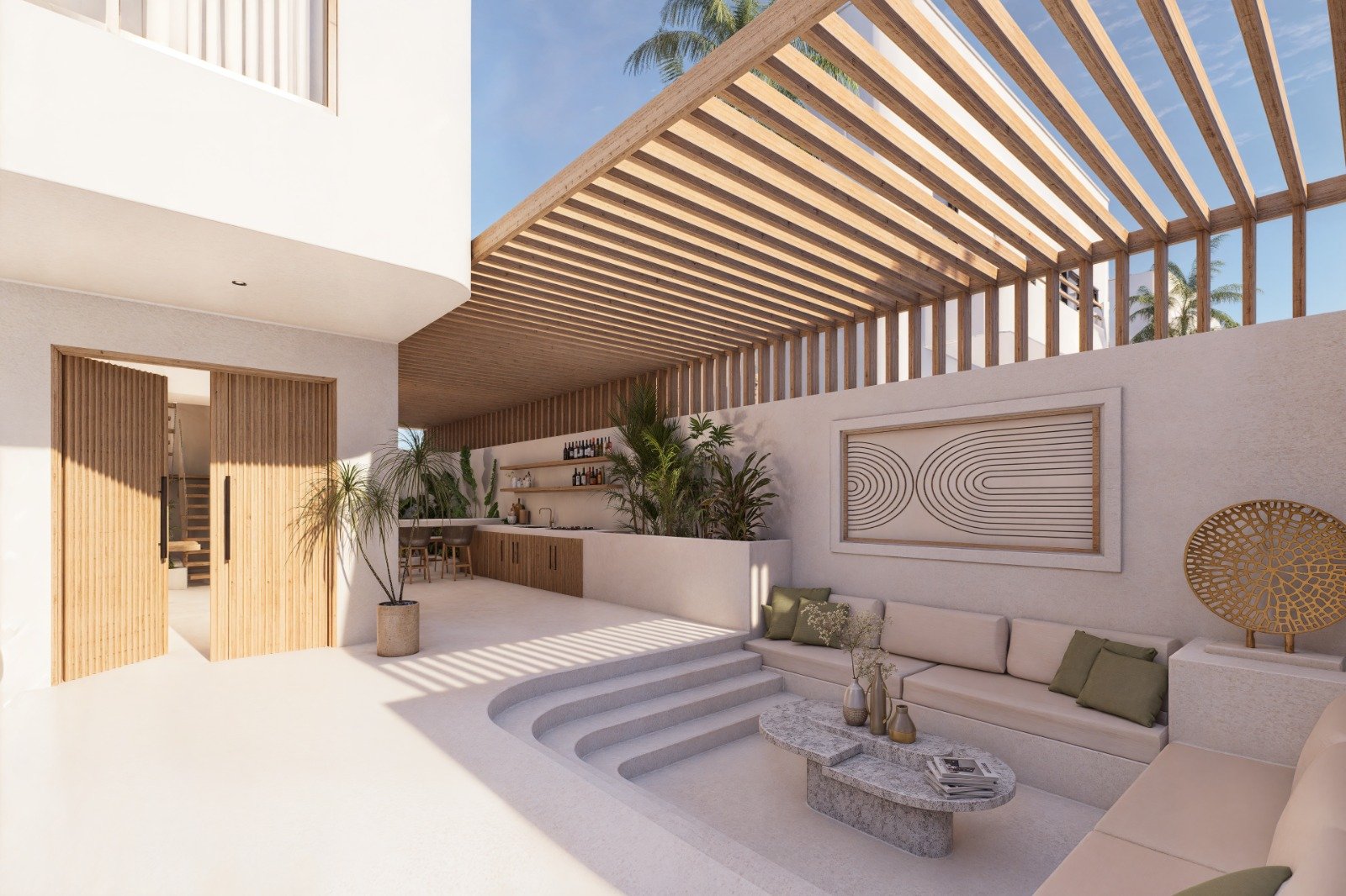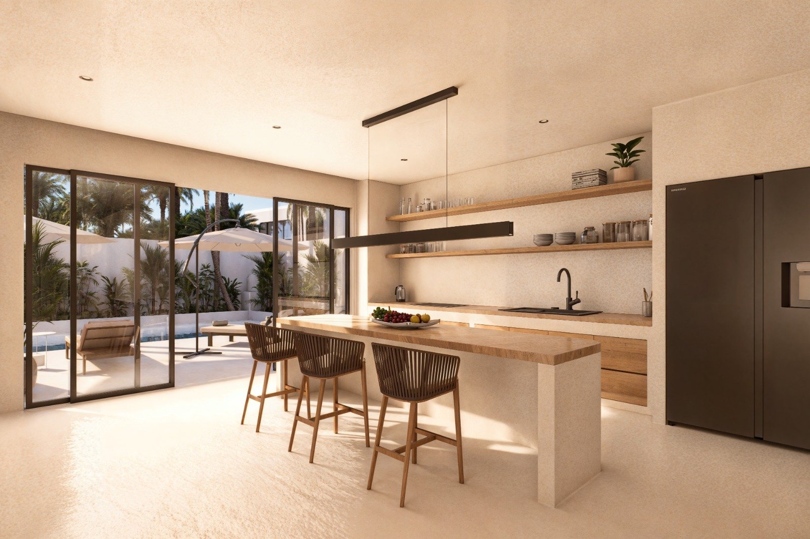 Outdoors, the villa features a private swimming pool with an outdoor sunken lounge, offering a relaxed setting for leisure and social gatherings. An outdoor shower enhances convenience and adds a resort-style touch to the pool area.