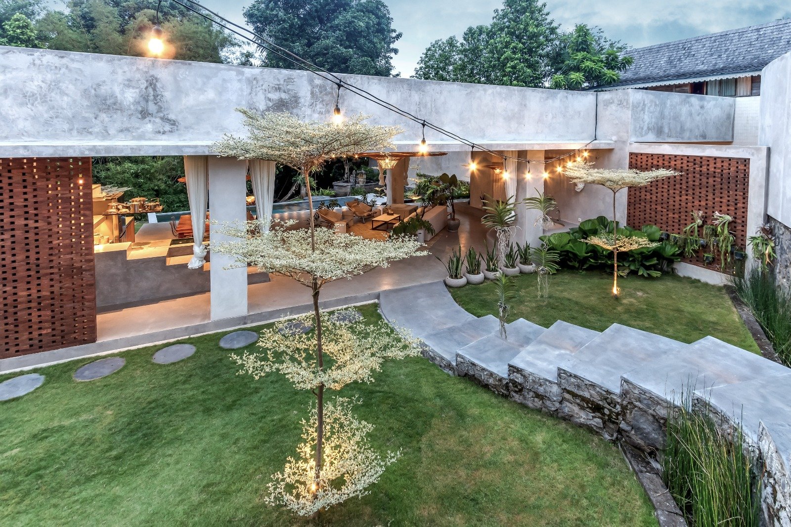 Inspired by Balinese rice terraces, the villa unfolds across three staggered platforms connected by 15 steps, with four bedrooms, a 180 sqm open-plan living area, and an elevated open-air cinema. The design blends contemporary geometry with traditional elements, featuring cream-tiled curved walls, red brick ventilation, and natural materials like pebble wash, concrete, and rattan.