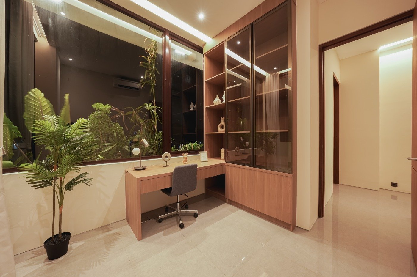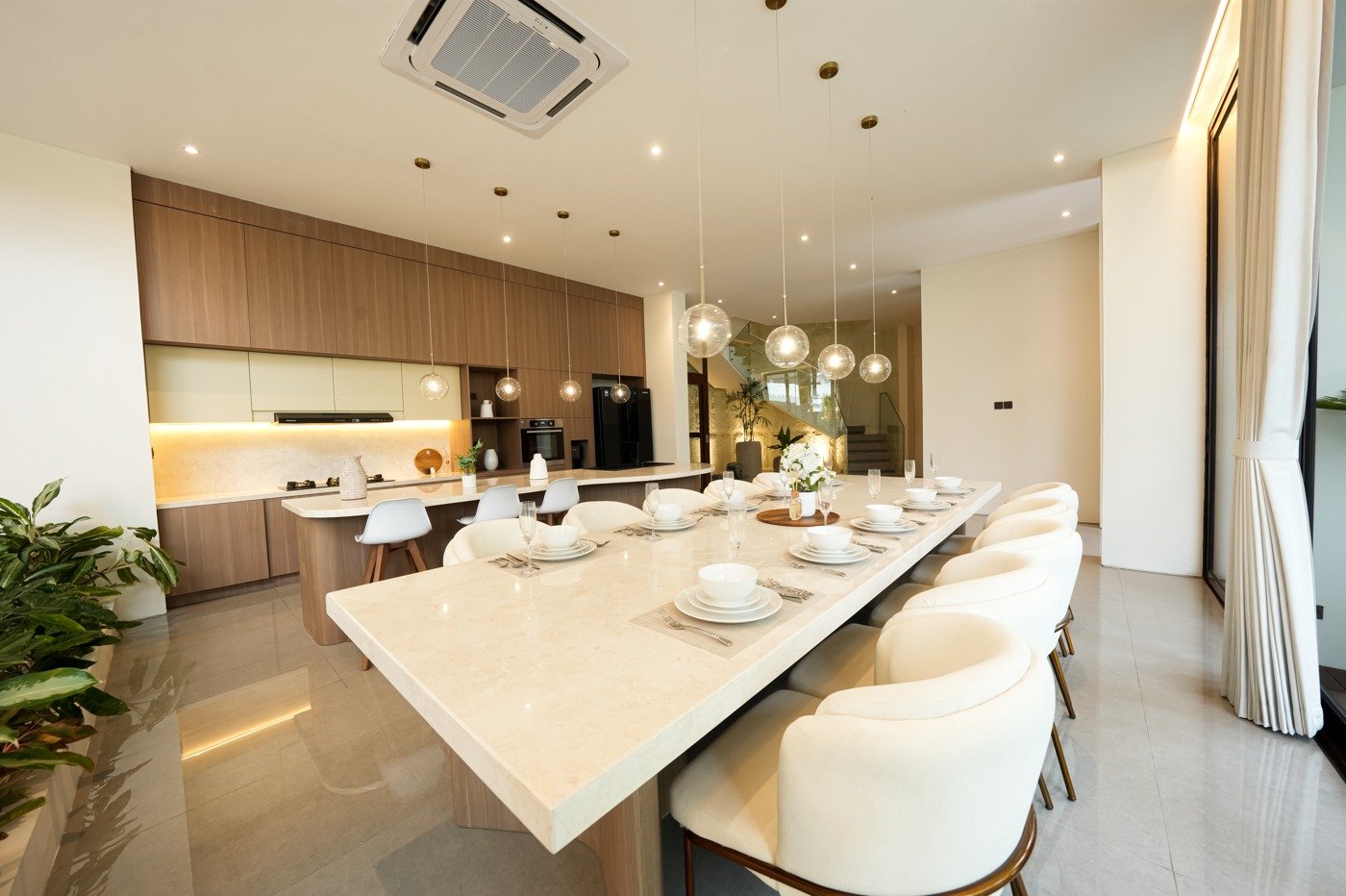 Each villa features a spacious built area of over 560 sqm, complete with 3 generously sized bedrooms, an open-concept living area, and large glass windows that allow abundant natural light to flow throughout the space. The interiors are elegantly designed with warm wooden accents, creating a sophisticated yet inviting atmosphere.