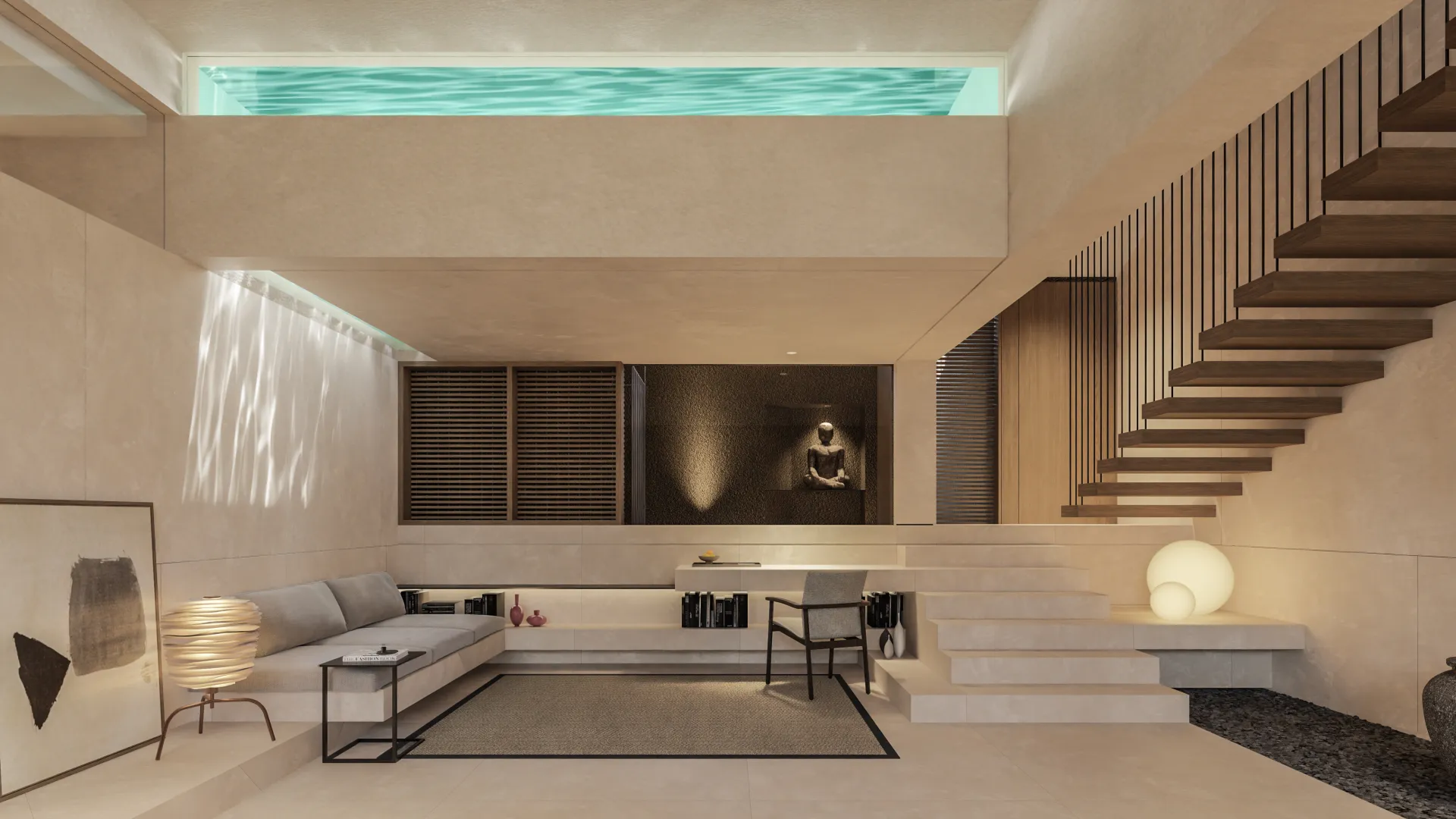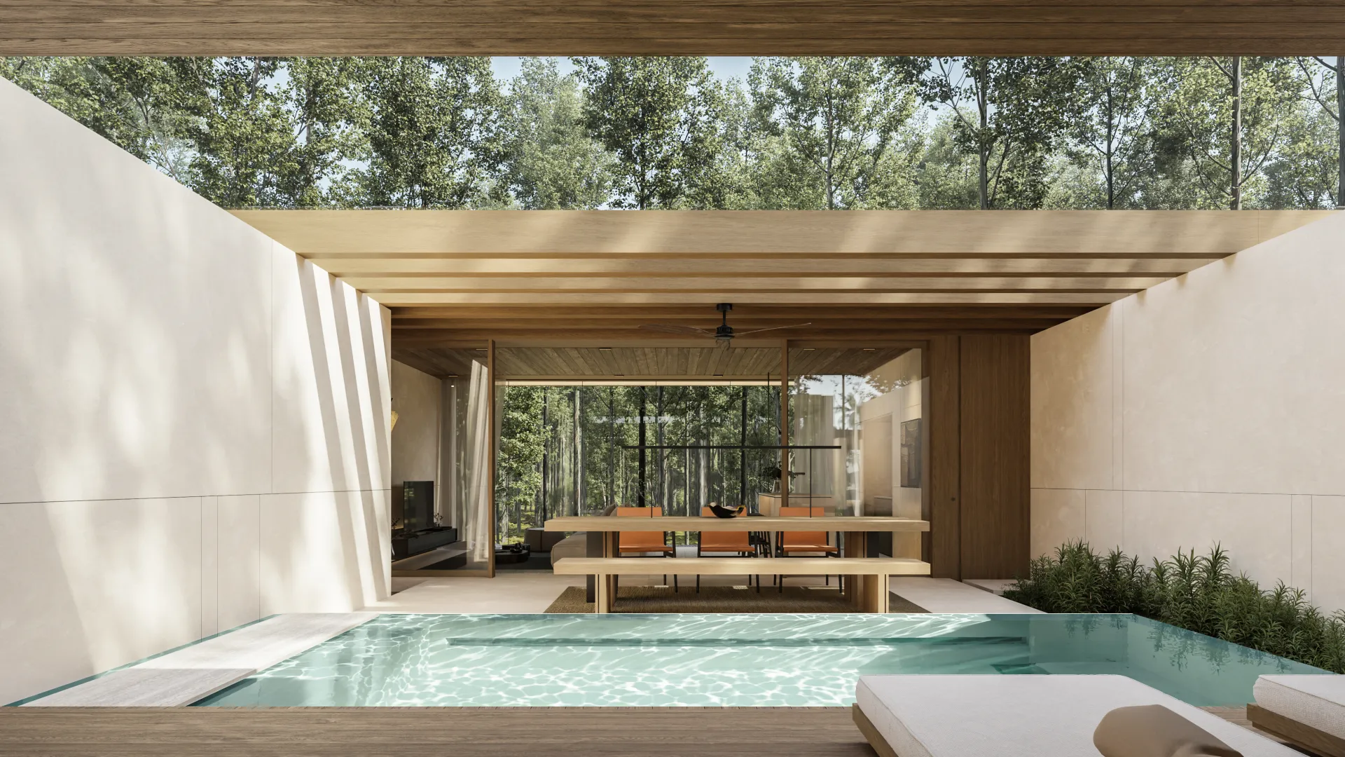 The outdoor area serves as an intimate extension of the home, complete with a private swimming pool framed by tropical greenery and tranquil terraces that invite relaxation amidst natural light and fresh air. Floor-to-ceiling glass doors blur the boundary between indoor luxury and outdoor serenity, creating a harmonious living experience deeply connected to nature.