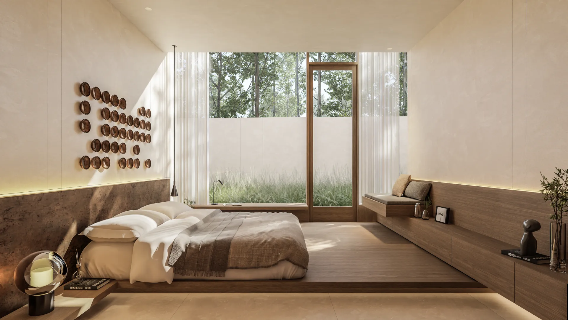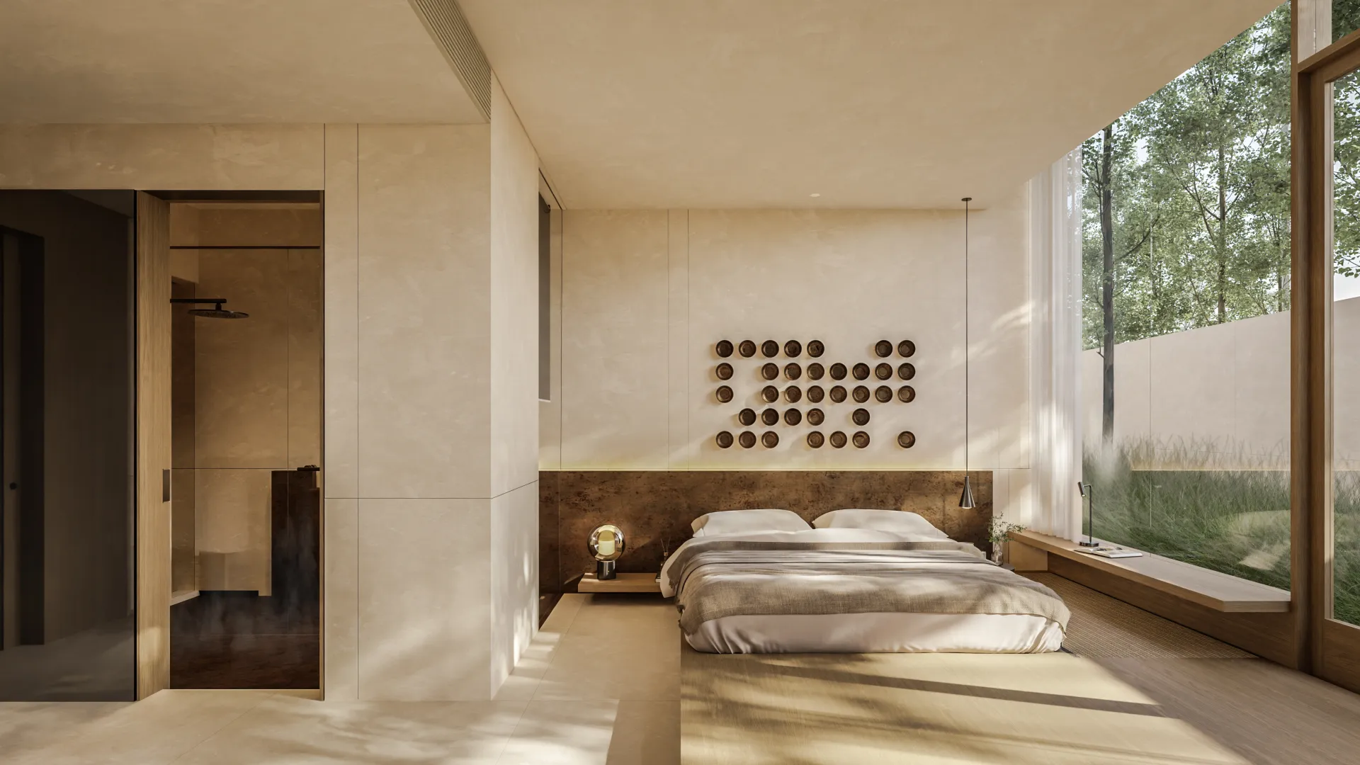Both bedrooms are spacious master suites with ensuite bathrooms, offering privacy, comfort, and refined elegance. The villa also features a purified water system and biophilic lighting design that follows the natural rhythm of the day, enhancing both well-being and sophistication. Within the gated high-end community, tree-lined walking paths and the signature Eucalyptus Forest Walk provide a refreshing setting for morning strolls or quiet reflection—embodying a new standard of luxury wellness living at Villa Canggu.
