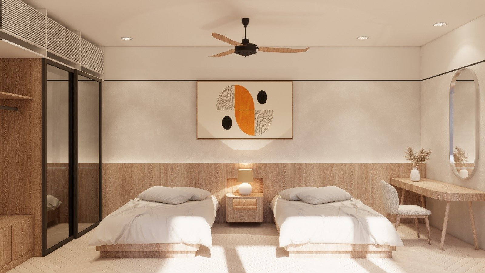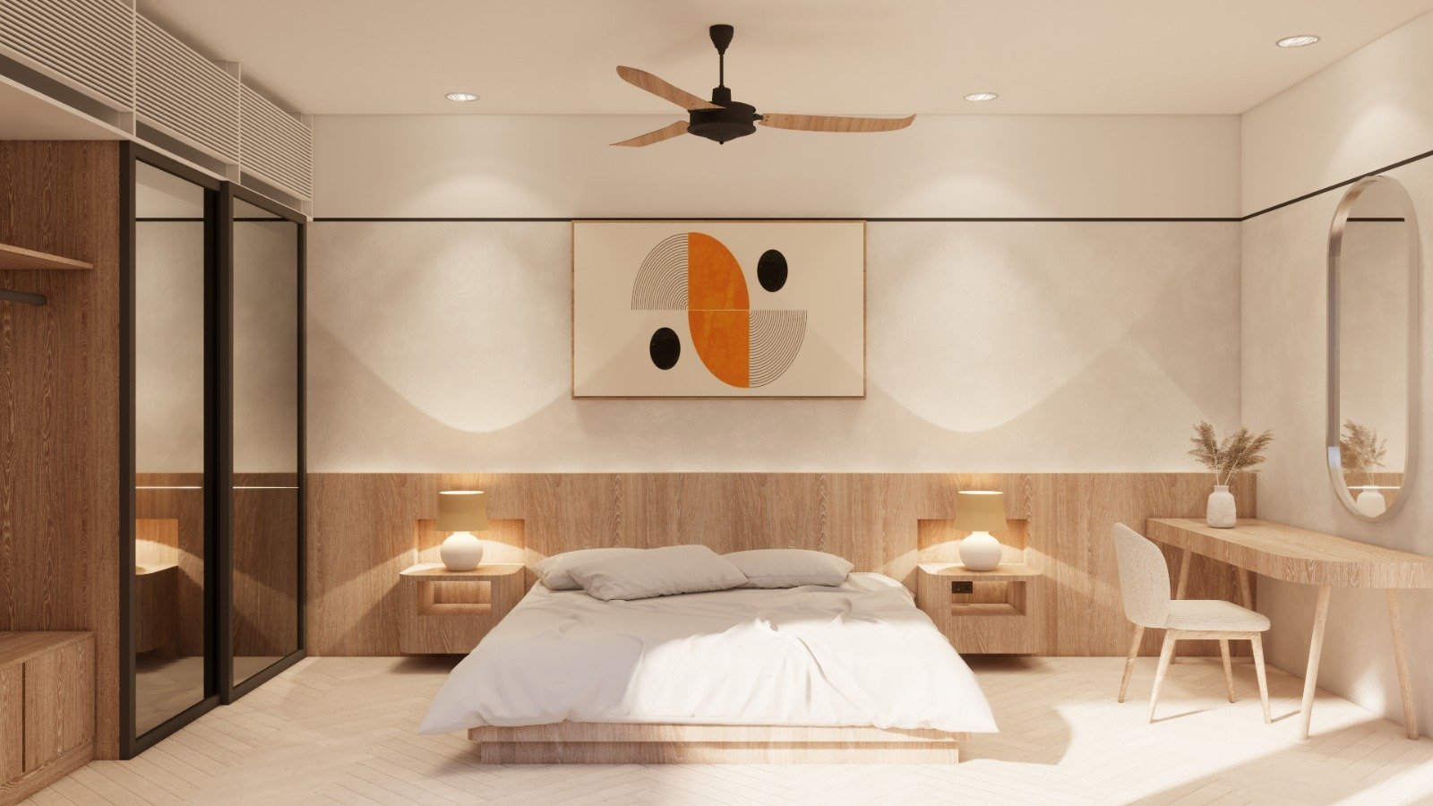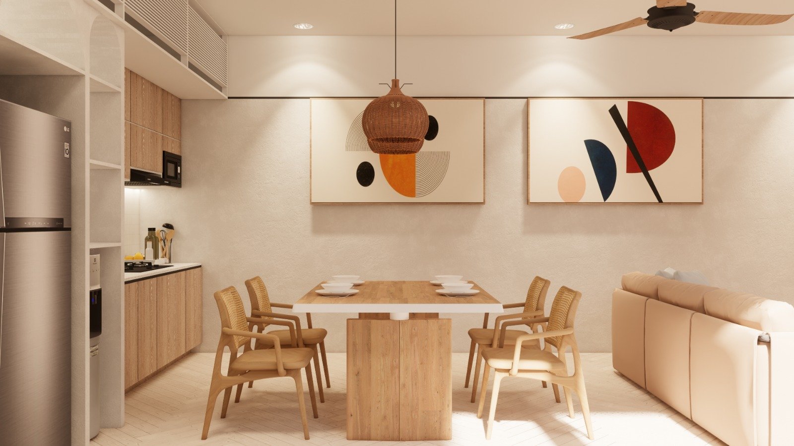 Each space is thoughtfully crafted to balance elegance and comfort, featuring spacious bedrooms with custom wood wardrobes, sleek modern bathrooms, and an open-plan living and dining area that flows seamlessly into a compact yet functional kitchen. The centerpiece of the home is a private swimming pool surrounded by lush greenery, creating a tranquil indoor-outdoor living experience.