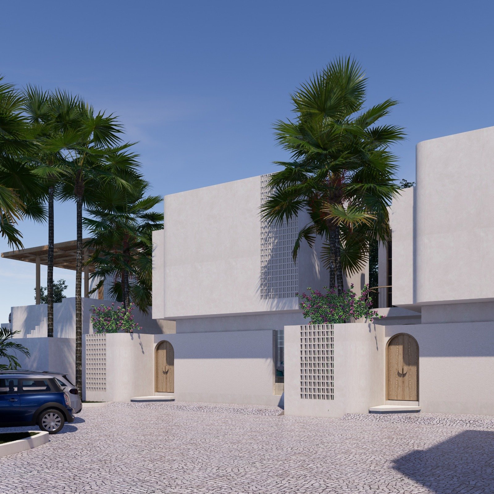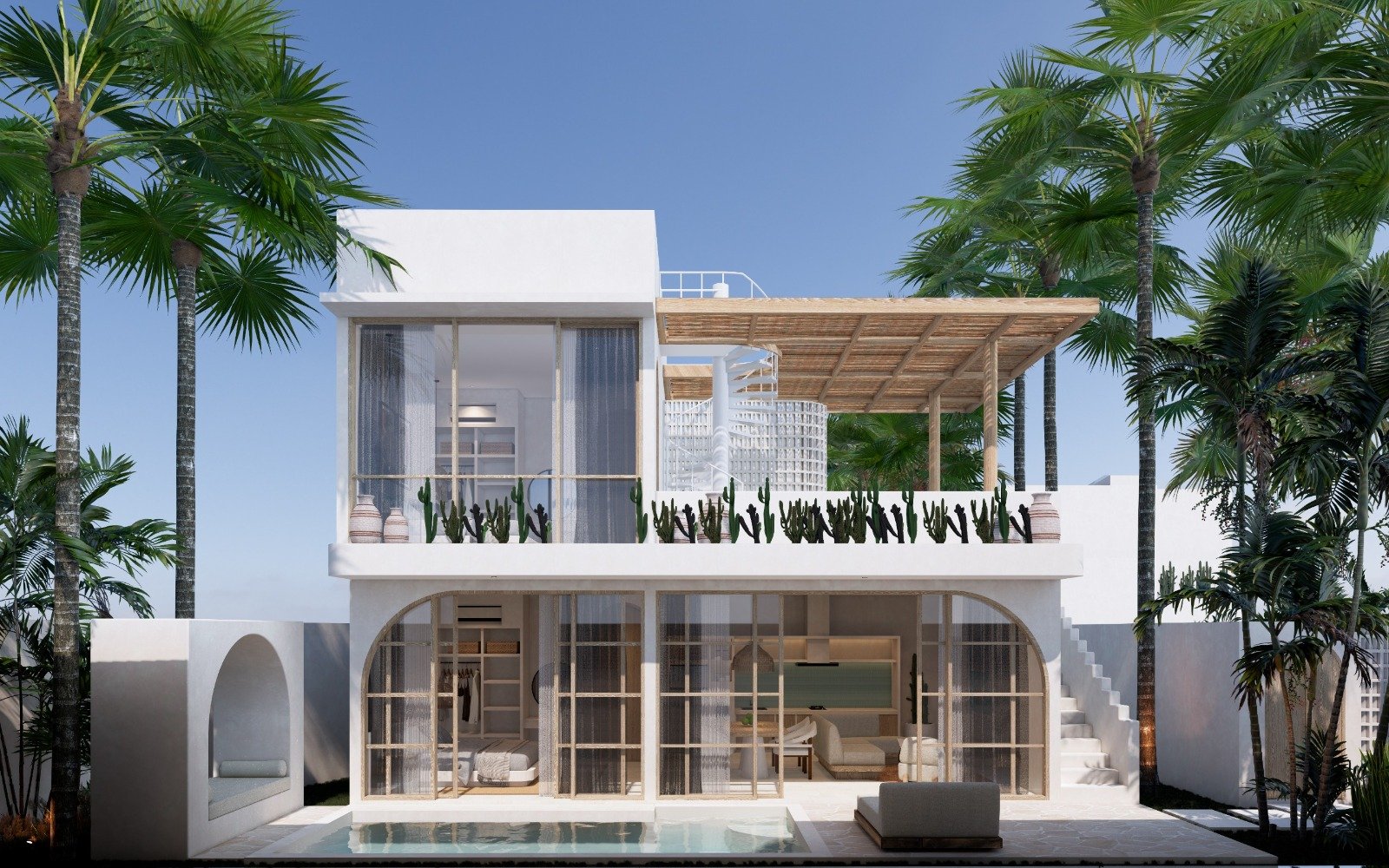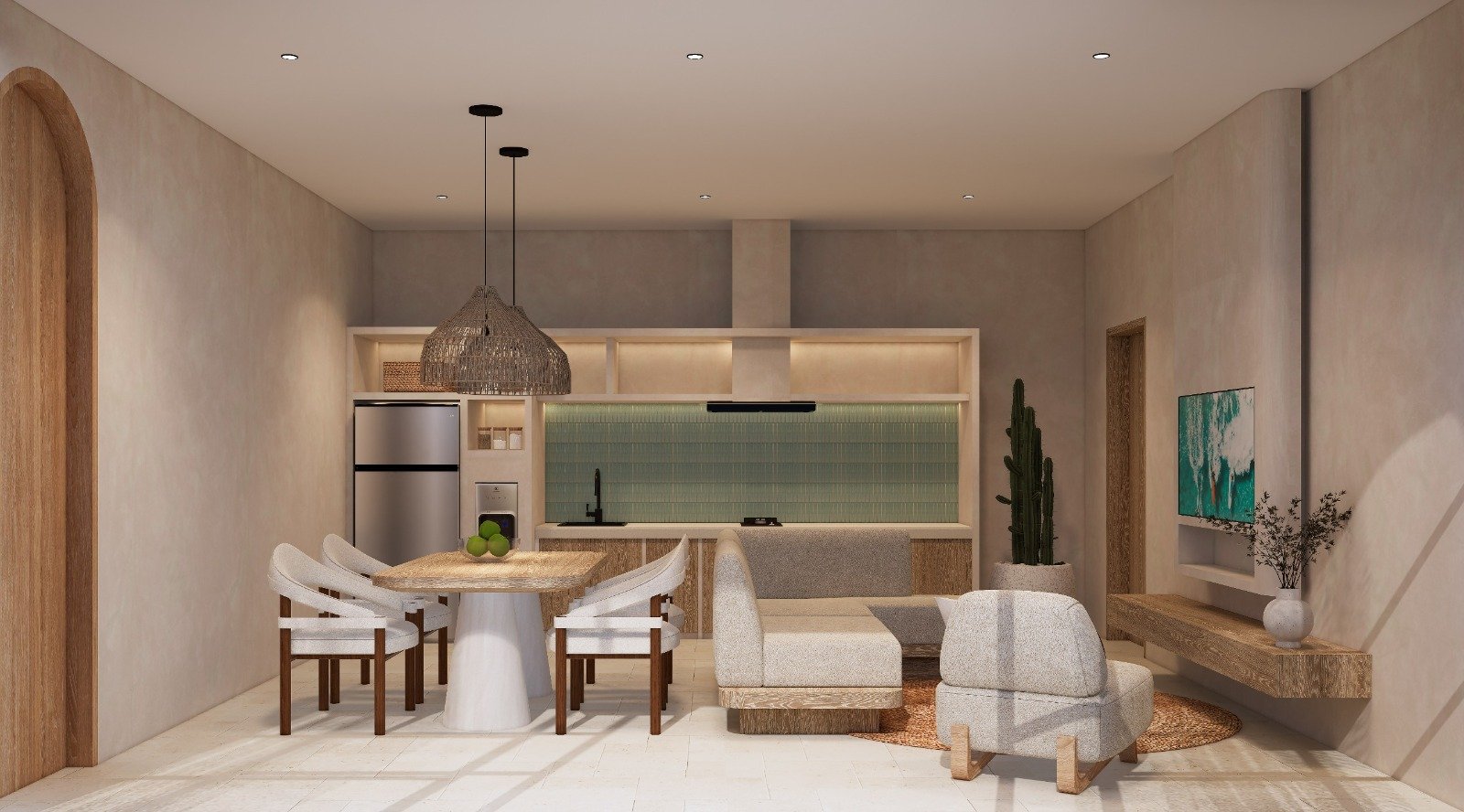 Each villa features 2 bedrooms, 2+1 bathrooms, a sunken living room, spacious kitchen and dining area, and a private pool with a sofa deck—all crafted to optimize natural light and comfort. The architecture blends natural stone, wood accents, and sustainable materials, ensuring both elegance and durability in Bali’s tropical climate.