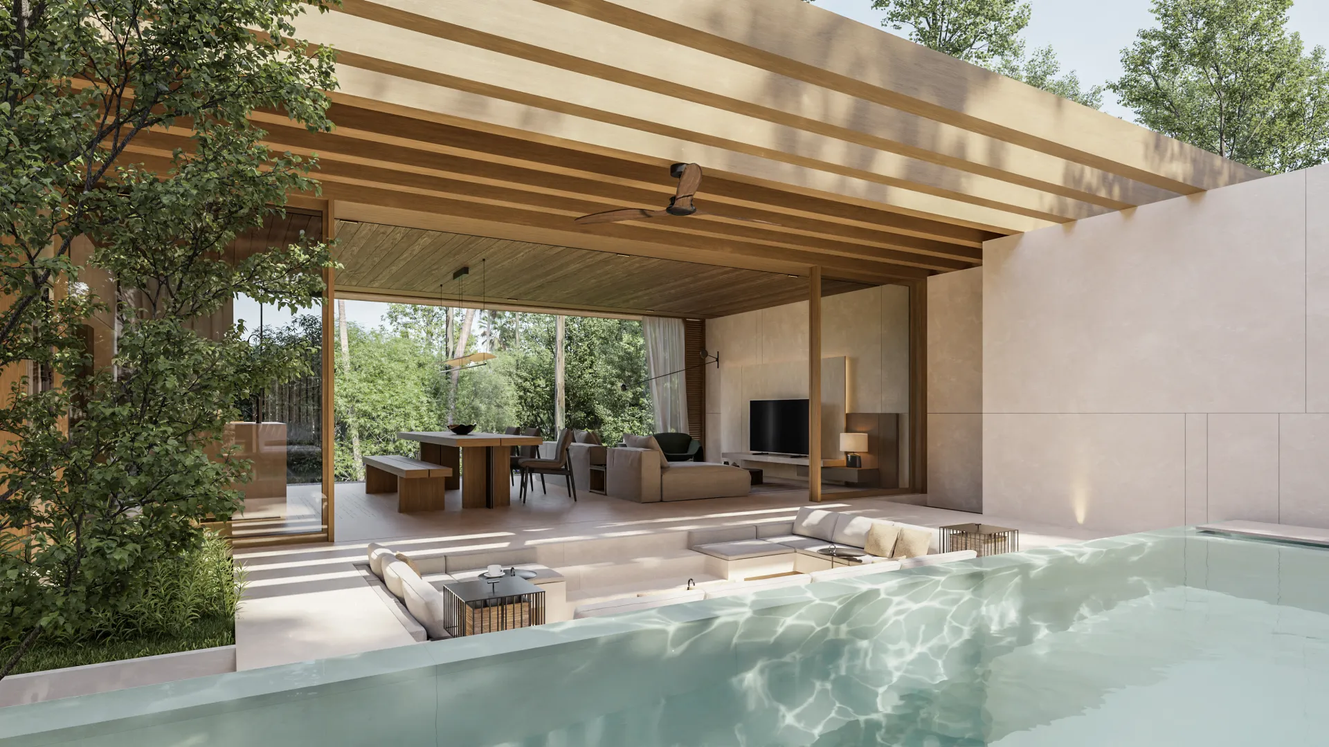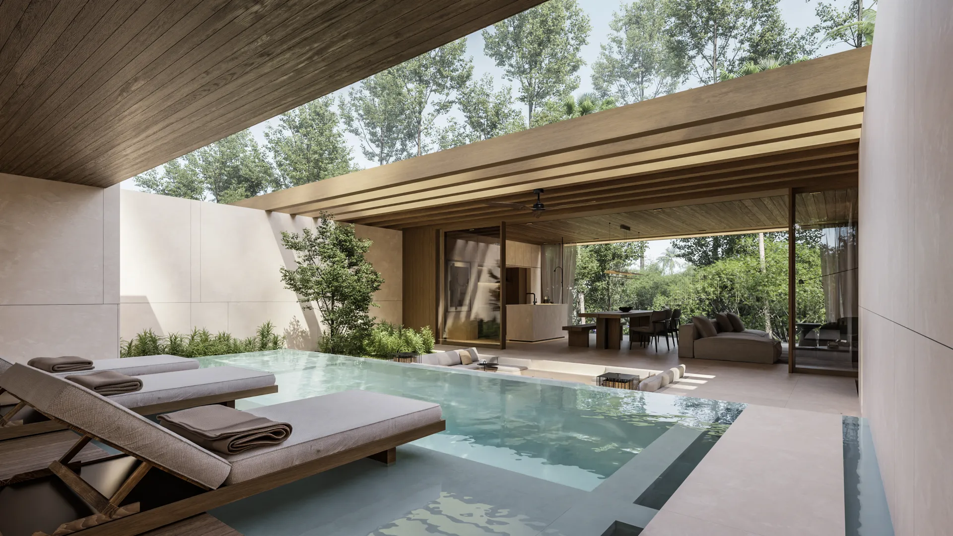 The outdoor area serves as a tranquil extension of the home, complete with a private swimming pool embraced by tropical greenery and a sunken lounge designed for relaxed gatherings or quiet moments under the open sky. Floor-to-ceiling glass doors create a fluid transition between indoor luxury and outdoor calm, allowing natural light and fresh air to fill the living space effortlessly.