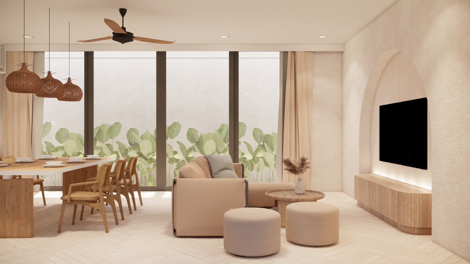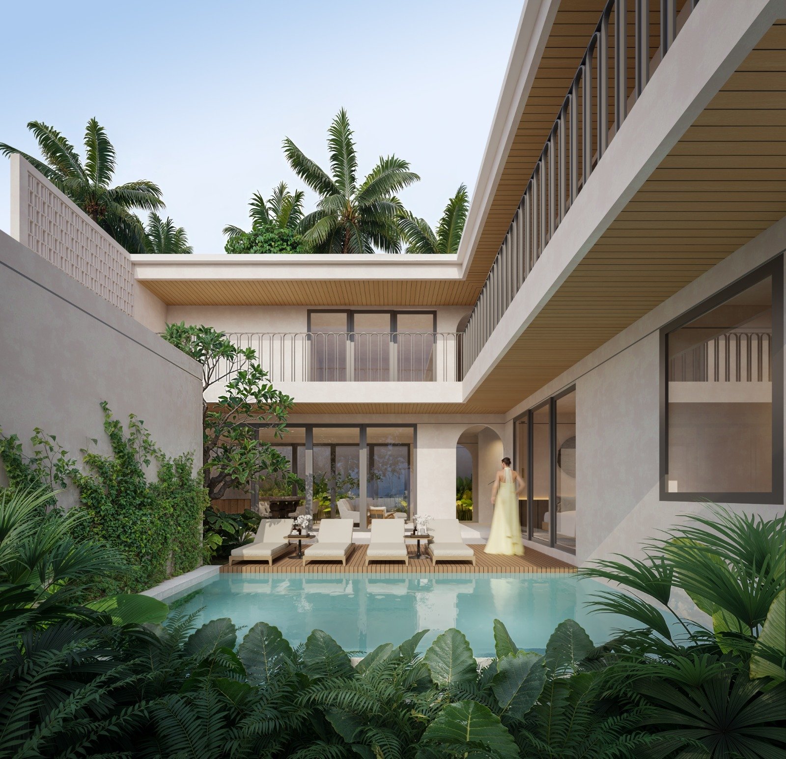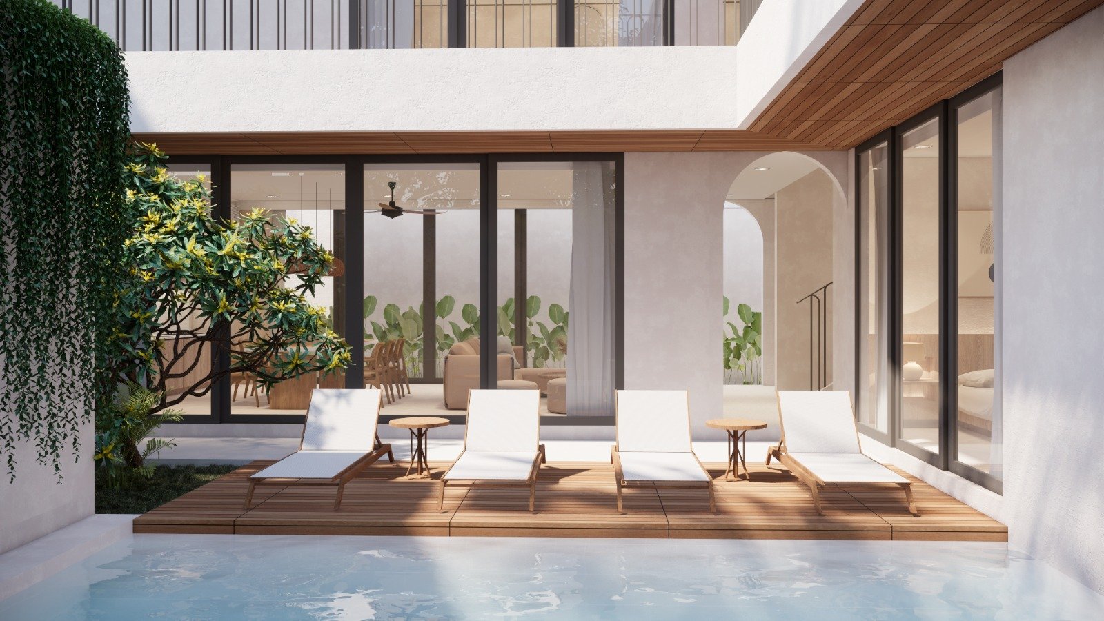Each space is thoughtfully crafted to balance elegance and comfort, featuring spacious bedrooms with custom wood wardrobes, sleek modern bathrooms, and an open-plan living and dining area that flows seamlessly into a compact yet functional kitchen. The centerpiece of the home is a private swimming pool surrounded by lush greenery, creating a tranquil indoor-outdoor living experience.