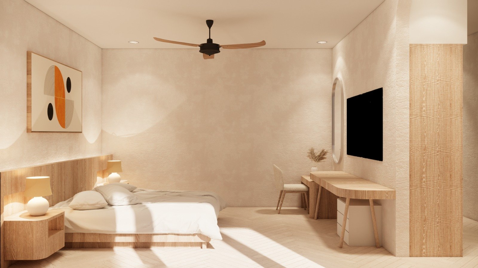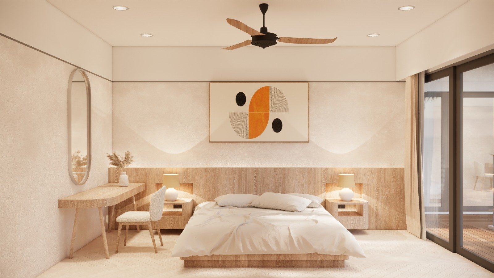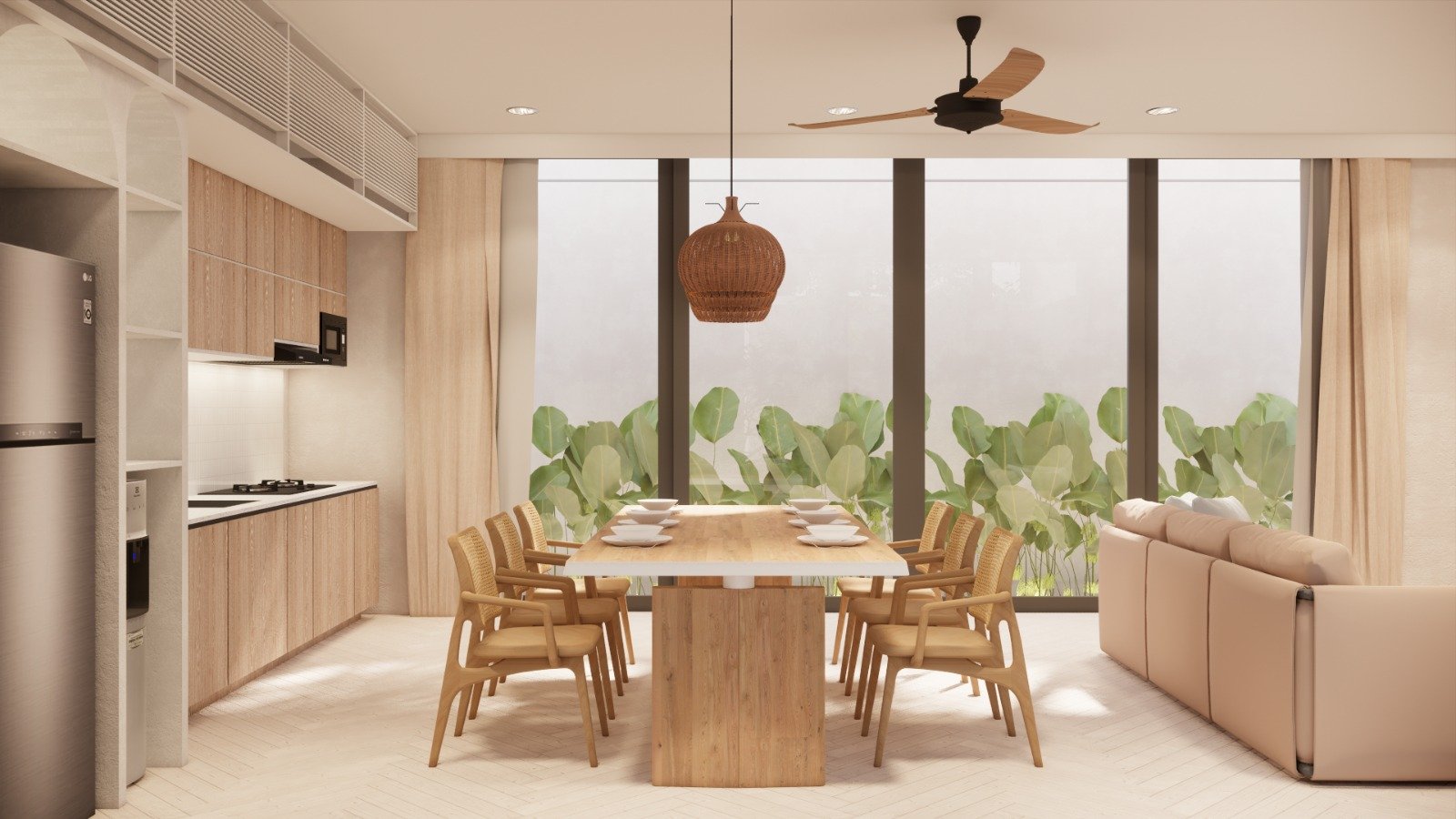 Each space is thoughtfully crafted to balance elegance and comfort, featuring spacious bedrooms with custom wood wardrobes, sleek modern bathrooms, and an open-plan living and dining area that flows seamlessly into a compact yet functional kitchen. The centerpiece of the home is a private swimming pool surrounded by lush greenery, creating a tranquil indoor-outdoor living experience.